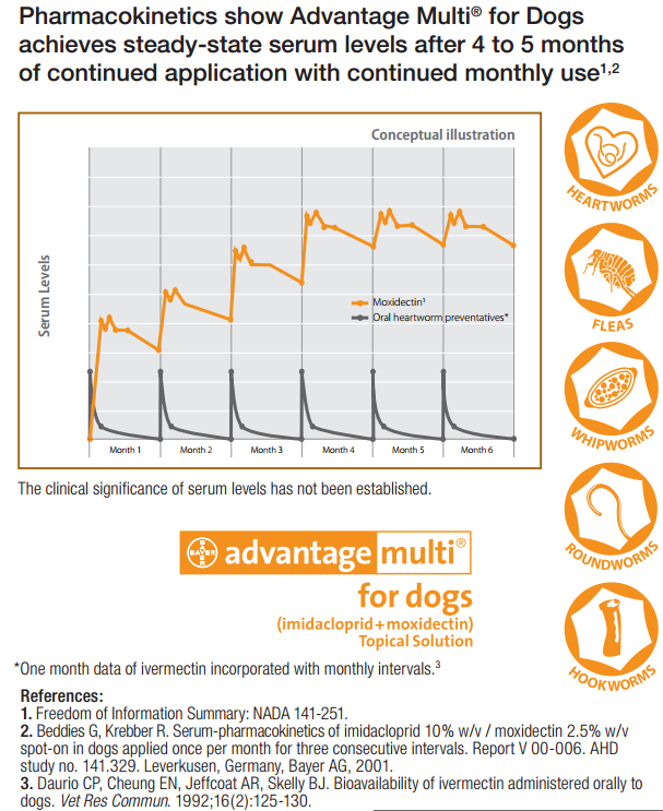경구용 사상충약(Ivermectin)의 경우 투여후 얼마 되지 않아 혈중농도가 급격히 떨어지는 체내 잔류량 감소를 보이는 반면 경피제(transdermal) 애드보킷은 혈중 약물농도가 서서히 감소하고, 4주 간격 투약시 하트가드와는 달리 이전 투약시보다 혈중농도가 상승하므로써 심장사상충 예방효과를 극대화시키고 있습니다.