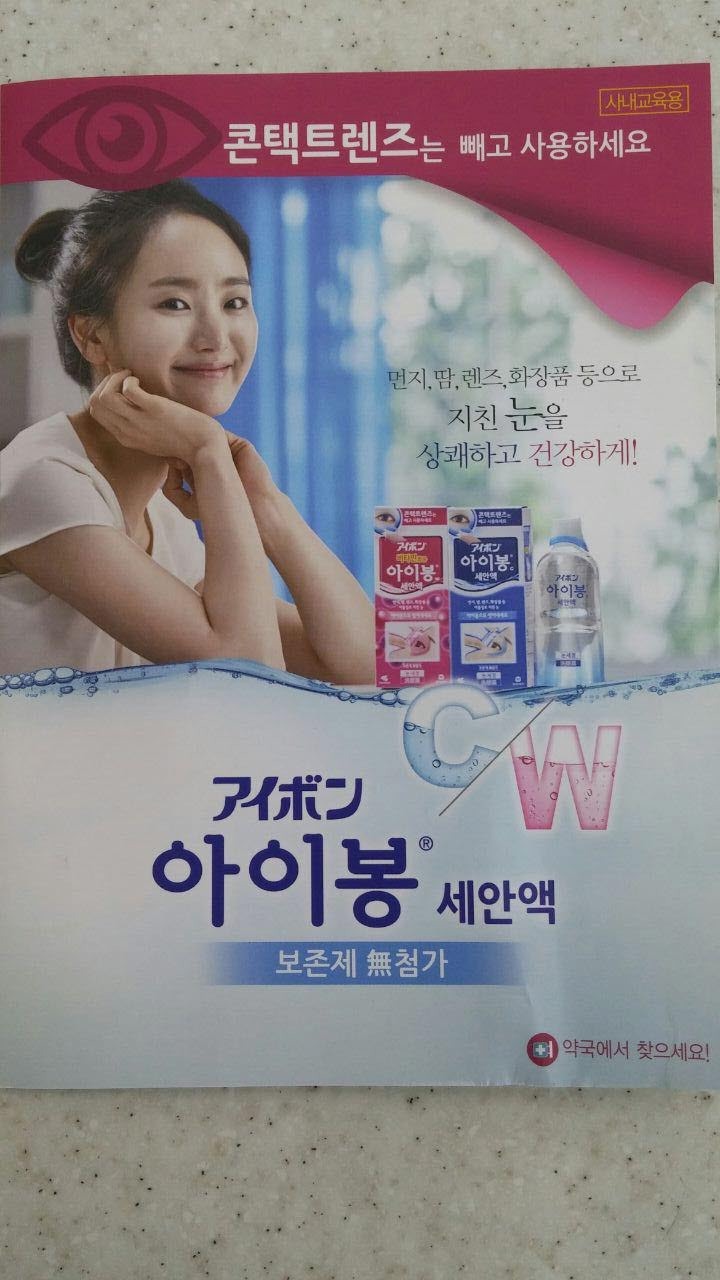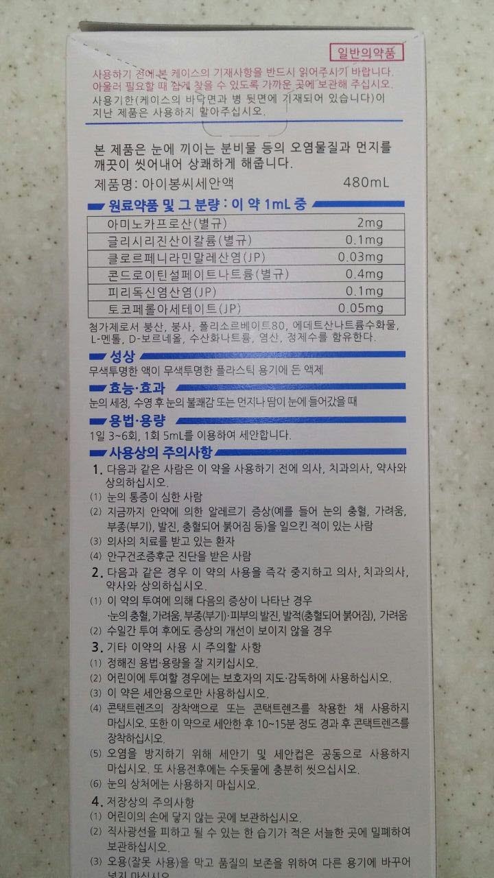 -‘아이봉’은 안구 세정제로서 눈병의 원인이 되는 눈 속 이물질 등 오염물질을 씻어낸다는 컨셉으로 개발되었습니다. 안약 성분을 함유하고 있지만 성분의 농도는 낮습니다.