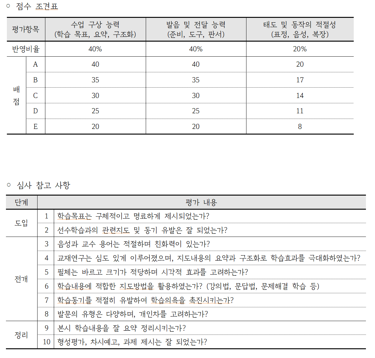 아래 사진은 모 사립학교에서 수업시연 할 때 채점 기준입니다. 참고하시기 바랍니다.