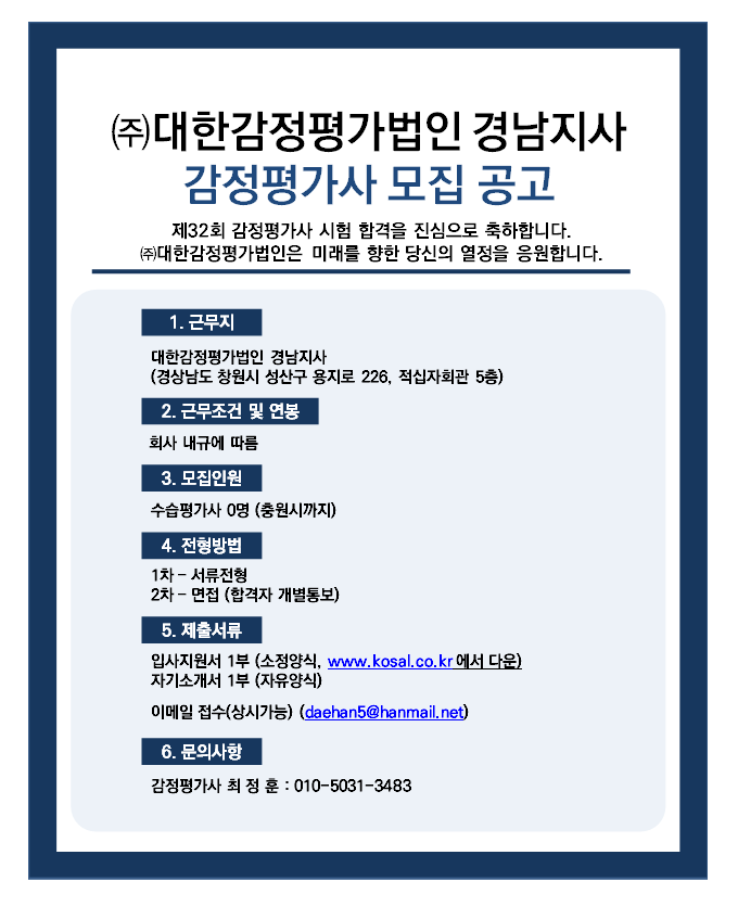 대한감정평가법인 경남지사는 경남지역에서 꿈을 펼치고 싶으신 열정있는 수습평가사님을 모집하고 있습니다.