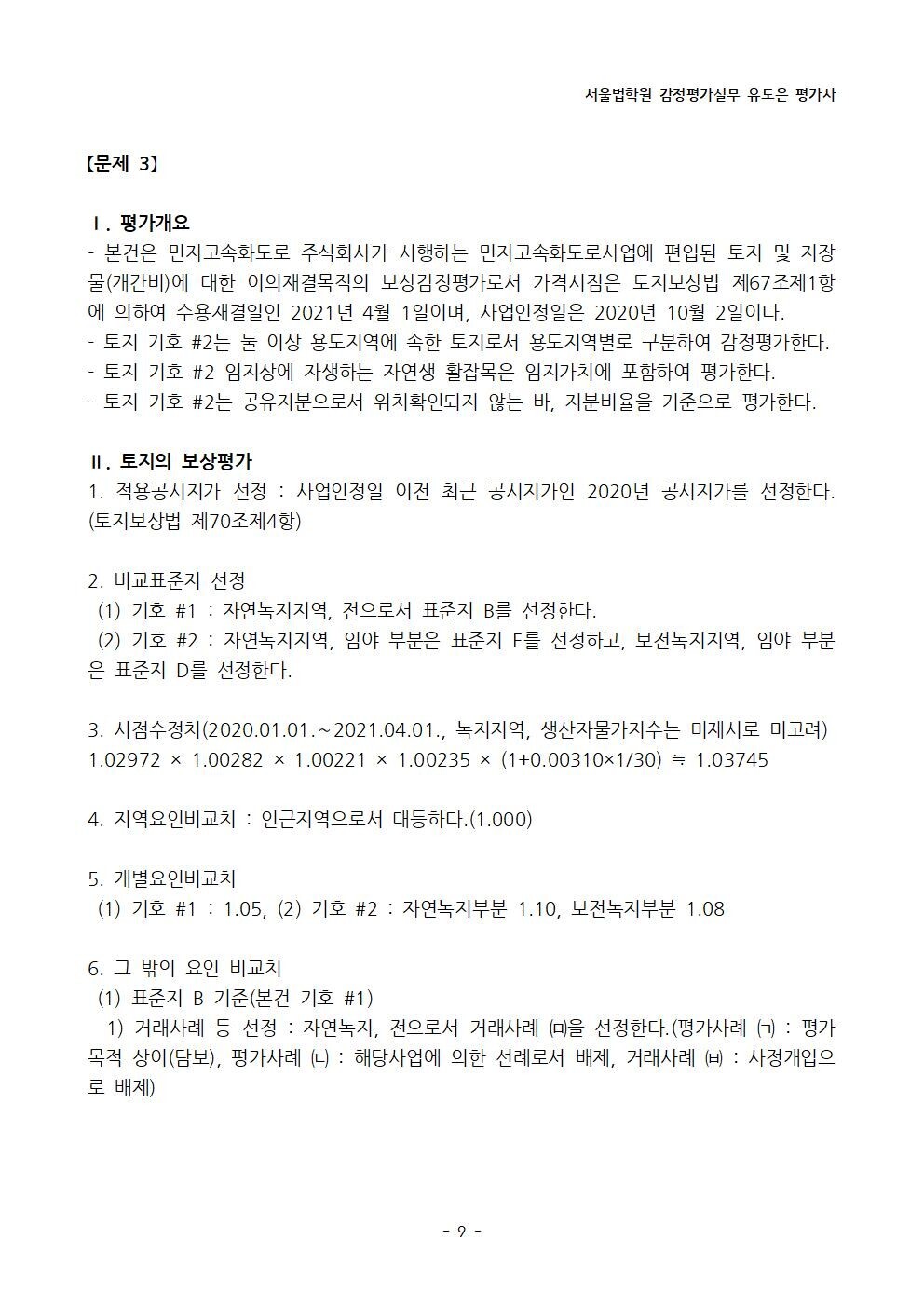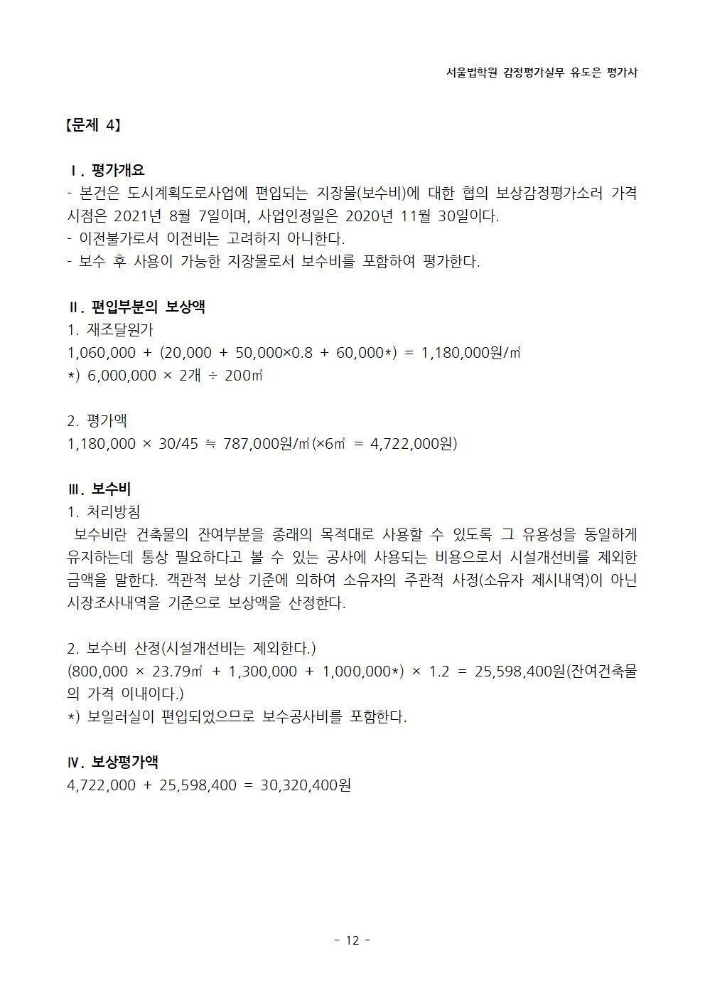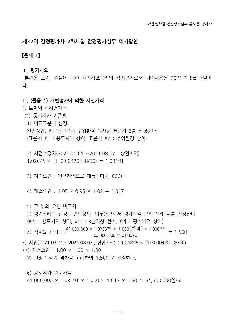 [예시답안] 제32회 감정평가실무 예시답안(유도은 평가사) 작성자서울법학원|작성시간21.08.09|조회수5,651 목록 댓글 0 글자크기 작게가 글자크기 크게가 32회 실무 예시답안.pdf154.37KB 첨부파일첨부된 파일이 13개 있습니다. jpg 파일 image002.jpg 다운로드 jpg 파일 image001.jpg 다운로드 jpg 파일 image003.jpg 다운로드 jpg 파일 image006.jpg 다운로드 jpg 파일 image004.jpg 다운로드 jpg 파일 image008.jpg 다운로드 jpg 파일 image005.jpg 다운로드 jpg 파일 image007.jpg 다운로드 jpg 파일 image009.jpg 다운로드 jpg 파일 image011.jpg 다운로드 jpg 파일 image010.jpg 다운로드 jpg 파일 image012.jpg 다운로드 pdf 파일 32회 실무 예시답안.pdf 다운로드 다음검색 현재 게시글 추가 기능 열기 북마크 공유하기 신고 센터로 신고 댓글 댓글 0 댓글쓰기 답글쓰기 댓글 리스트