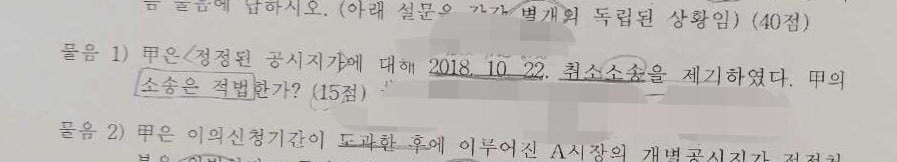갑이 공시지가가 위법하다고 주장하고 있으므로 1유형이며, 1유형에서 문제되는 기본소송요건은 대상적격과 권리보호필요성인데, 설문에서는 대상적격과 관련된 일부취소처분과 원처분의 관계가 문제되고, 그와 관련문제인 제소기간이 문제됩니다.