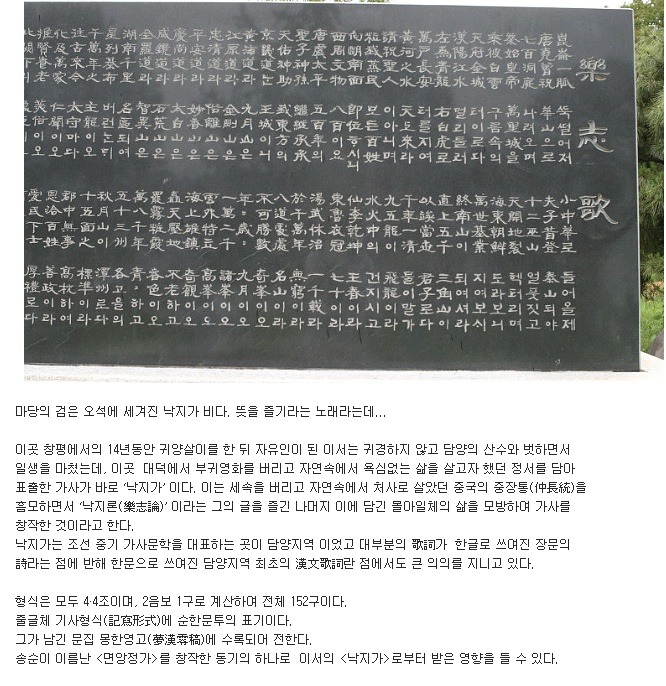 추성수(秋城守) 이서(李 緖)는 담양에 온지 14년되던 해 이과의 사건이 무고임이 밝혀져 유배에서 해제되었으나, 서울(한양)으로 돌아가지 않고 담양의 산천과 인심이 좋아 여생을 보내며 학문을 닦고 후학을 기릅니다.