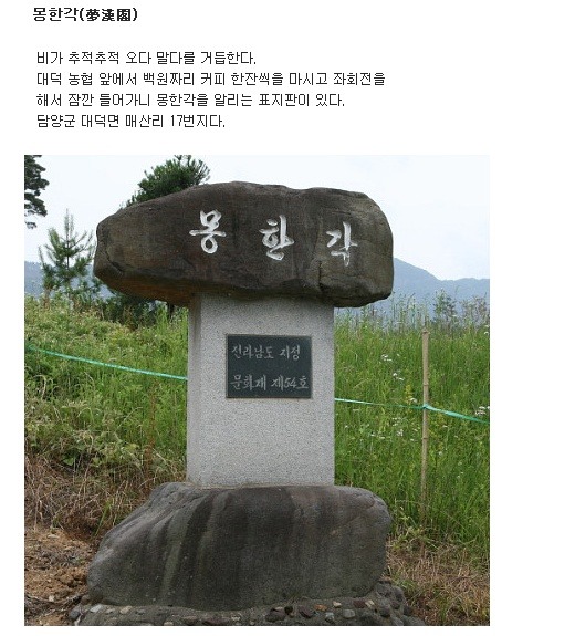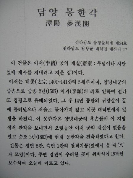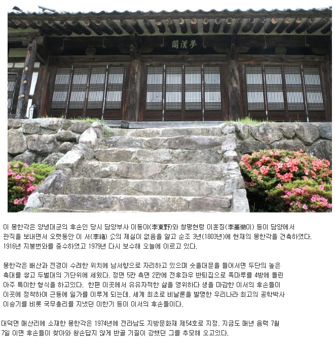 추성수(秋成守) 이서공(李緖公)의 재실(제사모시는 건물)인 몽한각은 조선순조대(1803년)에 같은 양녕대군파의 후손인 담양부사 이동야(李東野)와 창평현령(昌平縣令) 이훈징이 주축이 되어 건립하였습니다.