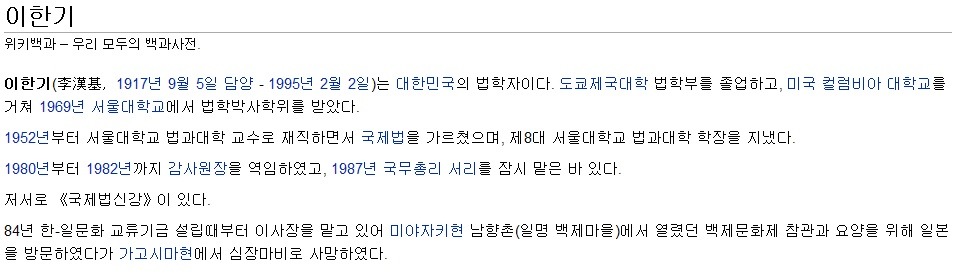 1917년생으로 지난1995년에 작고한 전 국무총리 서리이고 서울대 교수시절 세계적인 국제법학자였으며 감사원장(1980-1982)을 역임한 이 한기(李 漢基)박사는 전라남도 담양군 출신입니다.