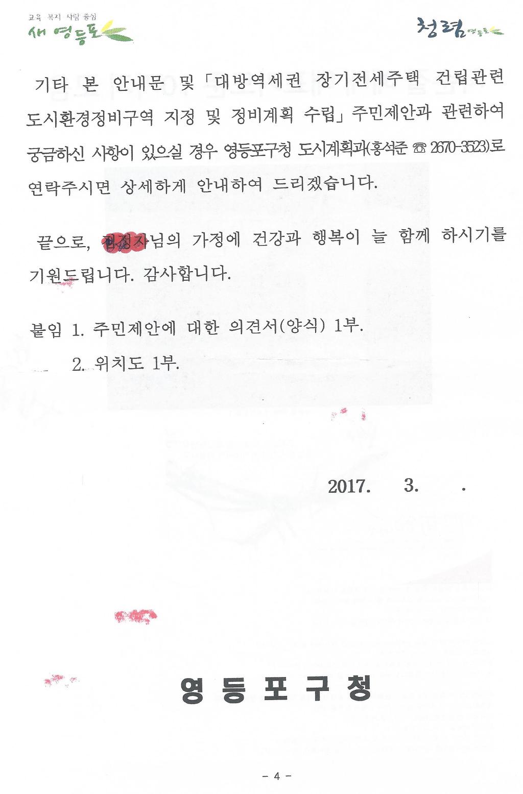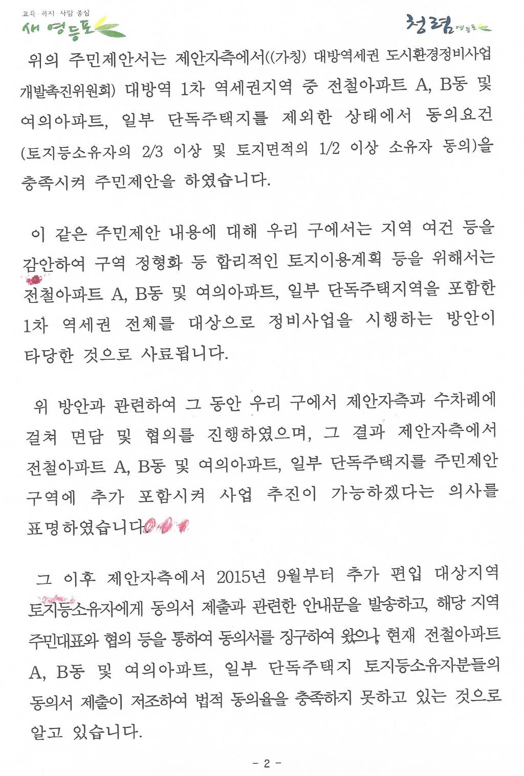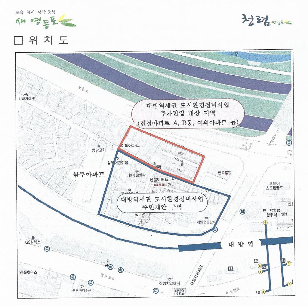 전철 아파트 C,D,E,F 와 2번지 일대(4600평)와 전철아파트 A,B동과 1번지 일대를 합하여 개발 하려는 영등포구청의 계획이 마무리를 지어 보려고 하는것 같습니다.
