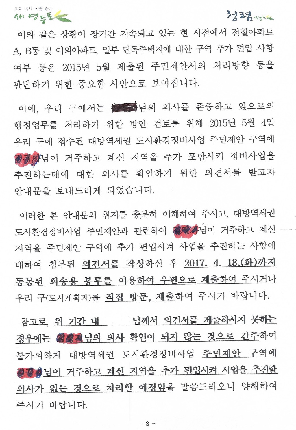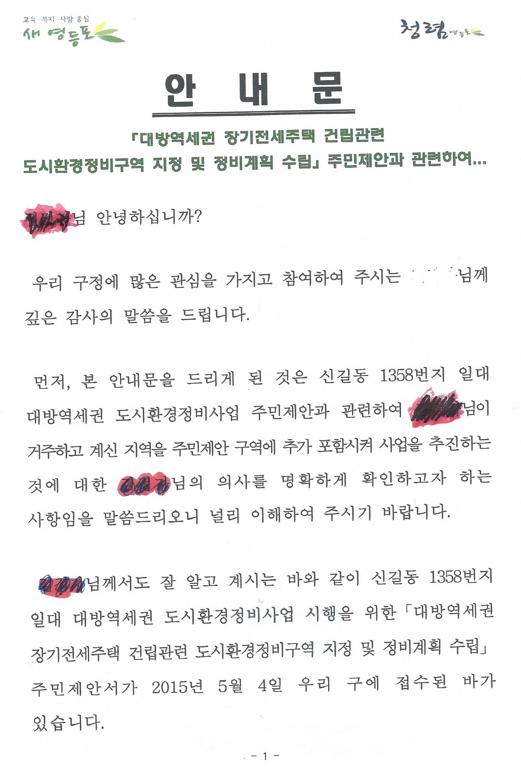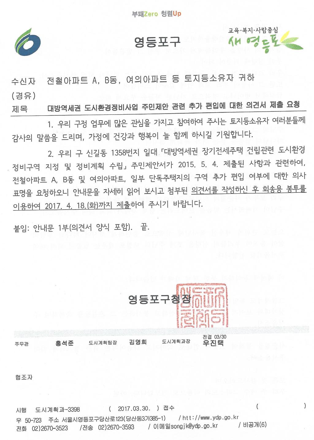 전철 아파트 C,D,E,F 와 2번지 일대(4600평)와 전철아파트 A,B동과 1번지 일대를 합하여 개발 하려는 영등포구청의 계획이 마무리를 지어 보려고 하는것 같습니다.