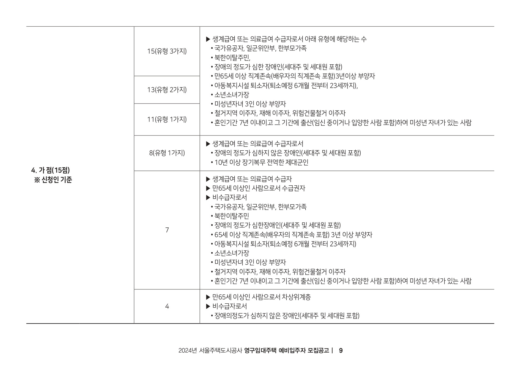 - 전년도 도시근로자 가구당 월평균소득의 70%이하의 국가유공자, 장애인, 북한이탈주민, 아동복지시설퇴소자 등