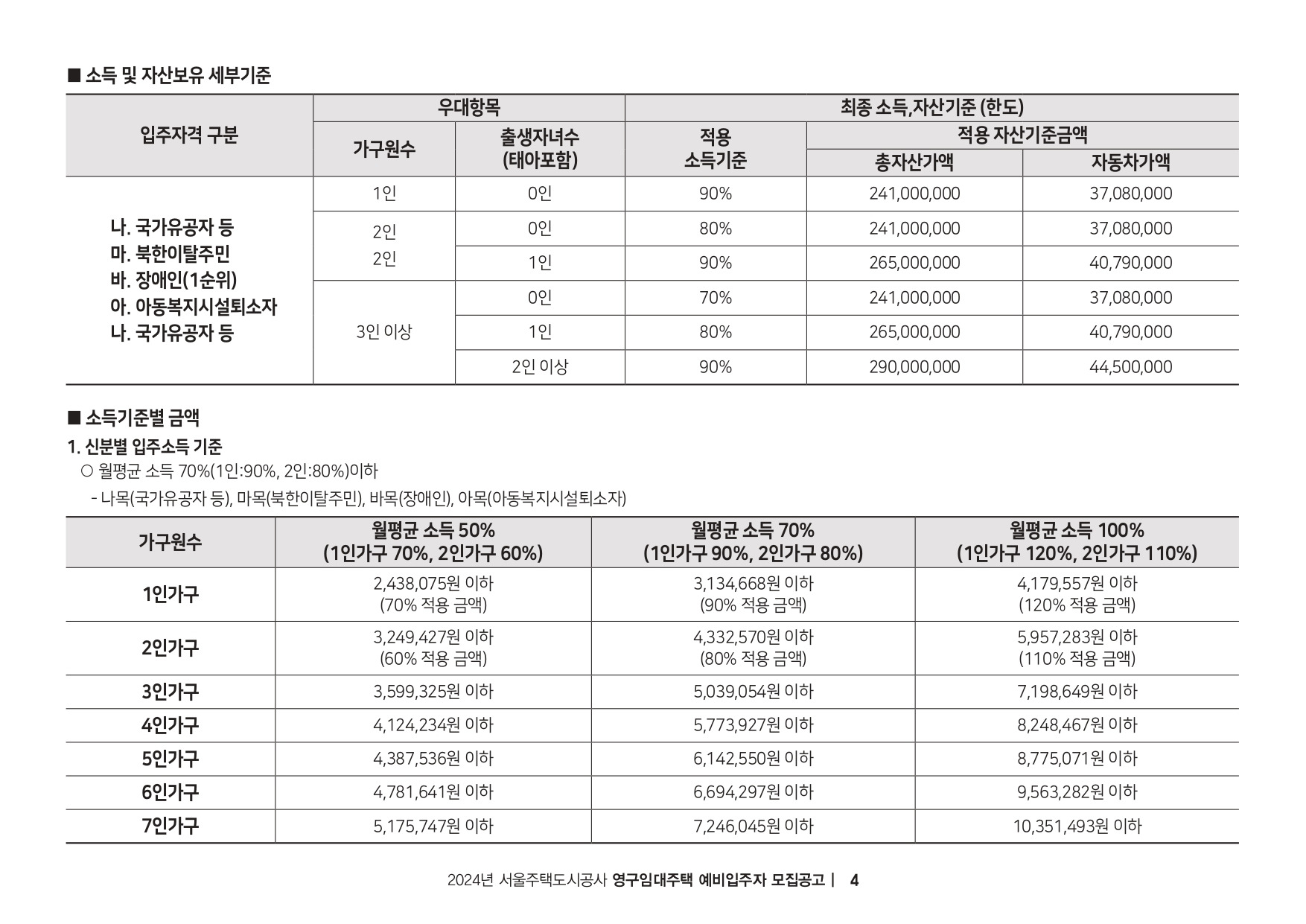 - 국가유공자, 장애인, 아동복지시설퇴소자 등 전년도 도시근로자 가구원수별 월 평균소득 70% 이하인 자 (가구원수 1인-90%,
