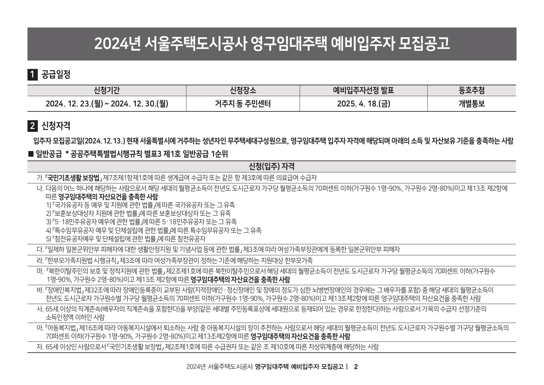※ 2024년 영구임대주택 예비입주자 모집에 신청하실 분은 첨부의 공고문을 참고하시기 바랍니다.