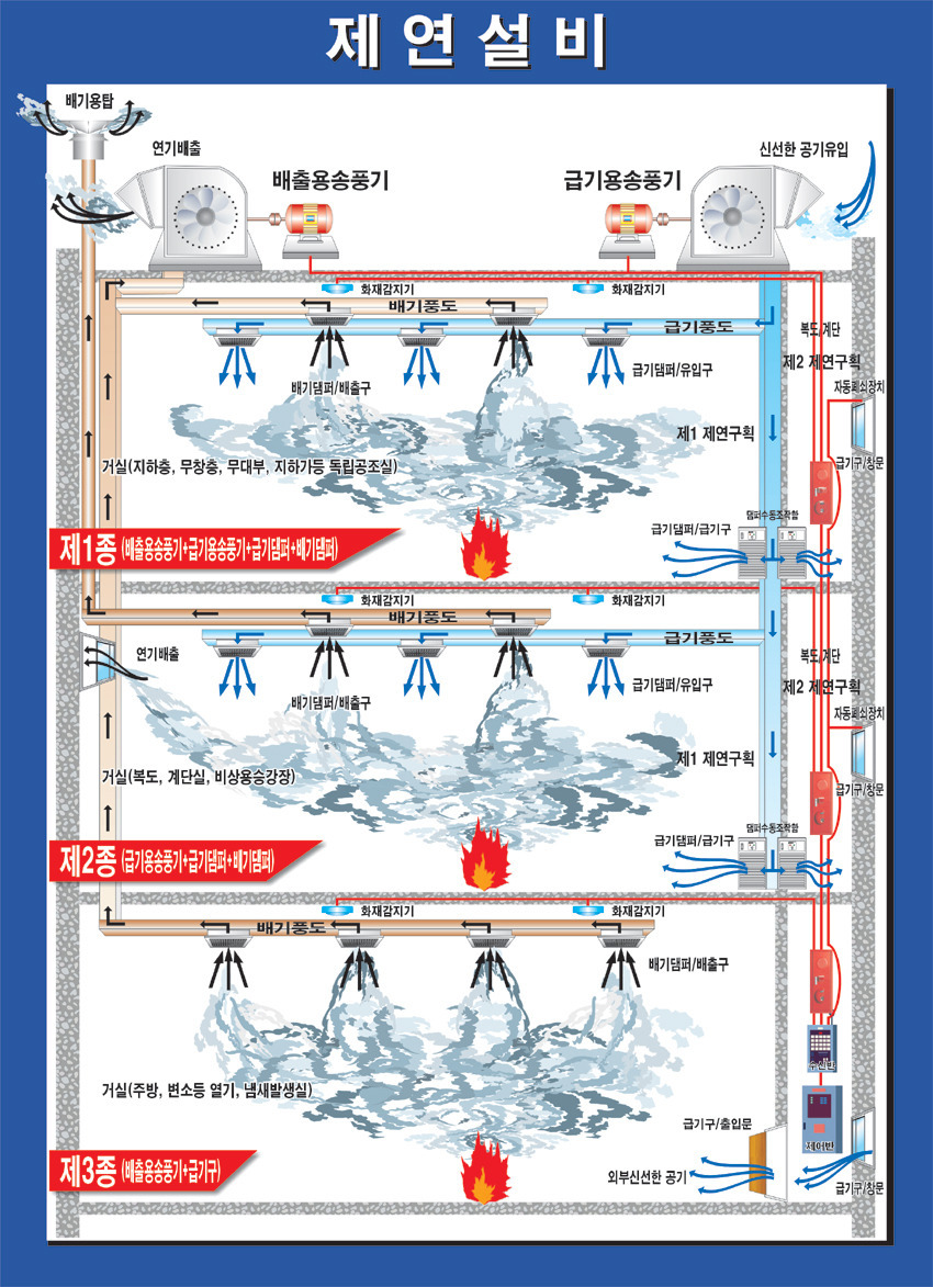화재가 발생하면 화재수신기의 신호를 받아서 급기 및 배기송풍기가 운전하기 시작하고 제연통로에는 제연댐퍼가 열리면서 연기를 흡입하면서 맑은 공기를 공급하여 피난로에 신선한 공기를 확보시켜 주는 것이다.