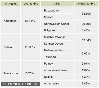 인도에서는 영국에 의해 1820 년부터 아라비카 (Arabica) 커피가 본격적으로 재배되기 시작하였다. 그 전에는 1610 년경 이슬람 순교자인 바바부단 (Bababudan) 가 카마타카 (Kamataka) 주 Chikmagalur에 예멘에서 가져온 아라비카 종을 심은 것이 최초이며, 로부스타종은 인도네시아 자바를 통해 1900~1905년 사이부터 재배되었다. 이후 아라비카종은 녹병 (Coffee-Rust)에 노출되어 수확량이 감소하였는데 그에 따라 맛과 향의 질도 낮아졌다. 이런 이유로 1930 년대 부터 재배되기 시작한 것이 수확량이 많고 녹병에도 강한 Kent 종이다. 인도의 토양은 비옥한 편이며 10월과 11월 사이에 동부해안지방을 중심으로 약 3,500mm의 많은 비가 내린다. 6 월~7월 사이에는 고온다습한 남서풍이 불어 몬순기후가 나타난다. 아라비카종은 1,000~1,600m의 고지대에서 재배되며 수확 시기는 11월 ~ 2월이다. 한편 로부스타는 상대적으로 낮은 저지대 (500~1,000m)에서 재배되어 12월~3월 사이에 수확이 이루어진다.