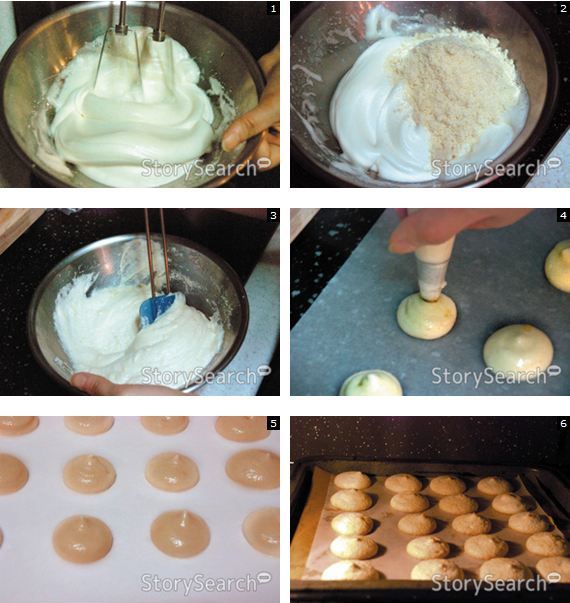 슈거 파우더 1과 1/4컵, 아몬드 가루 1컵, 계란 흰자 1/4컵 + 2 테이블 스푼