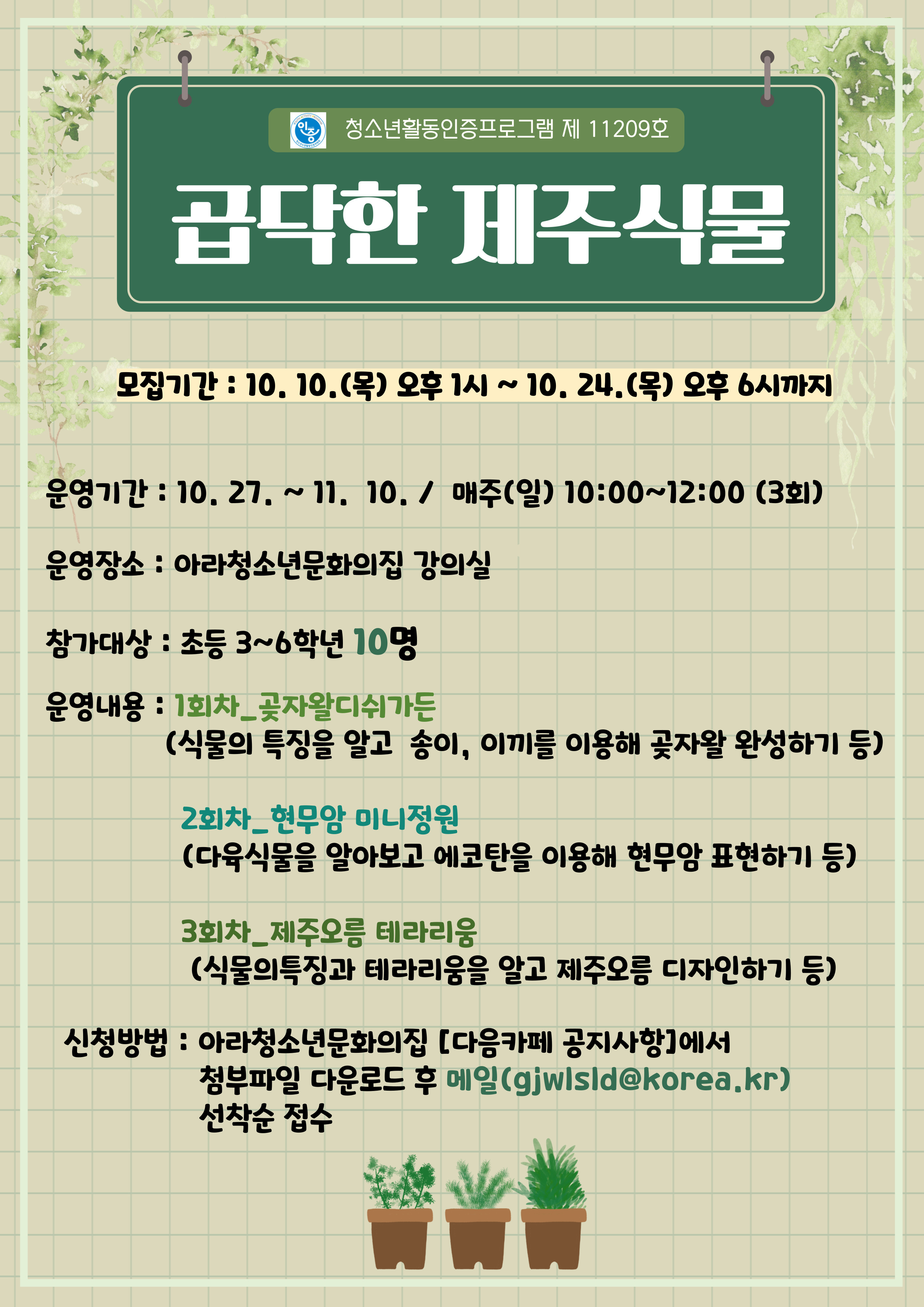 2024 곱닥한 제주 식물 참가자 모집 안내 작성자램프의 요정|작성시간24.10.08|조회수257 목록 댓글 2 글자크기 작게가 글자크기 크게가 곱닥한 제주 식물 신청서(241008).hwp40.00KB 첨부파일첨부된 파일이 2개 있습니다. jpg 파일 곱닥한제주식물-001.jpg 다운로드 hwp 파일 곱닥한 제주 식물 신청서(241008).hwp 다운로드 다음검색 현재 게시글 추가 기능 열기 북마크 공유하기 신고 센터로 신고 댓글 댓글 2 댓글쓰기 답글쓰기 댓글 리스트 작성자애국자 | 작성시간 24.10.14 모집 마감되었나요? 답댓글 작성자램프의 요정 작성자 본인 여부 작성자 | 작성시간 24.10.23 확인이 너무 늦었네요. 혹여나 저희가 확답이 없을시에는 전화로 문의 부탁드릴게요.1자리 남아 있긴 하니 전화 문의 부탁드릴게요 댓글 전체보기