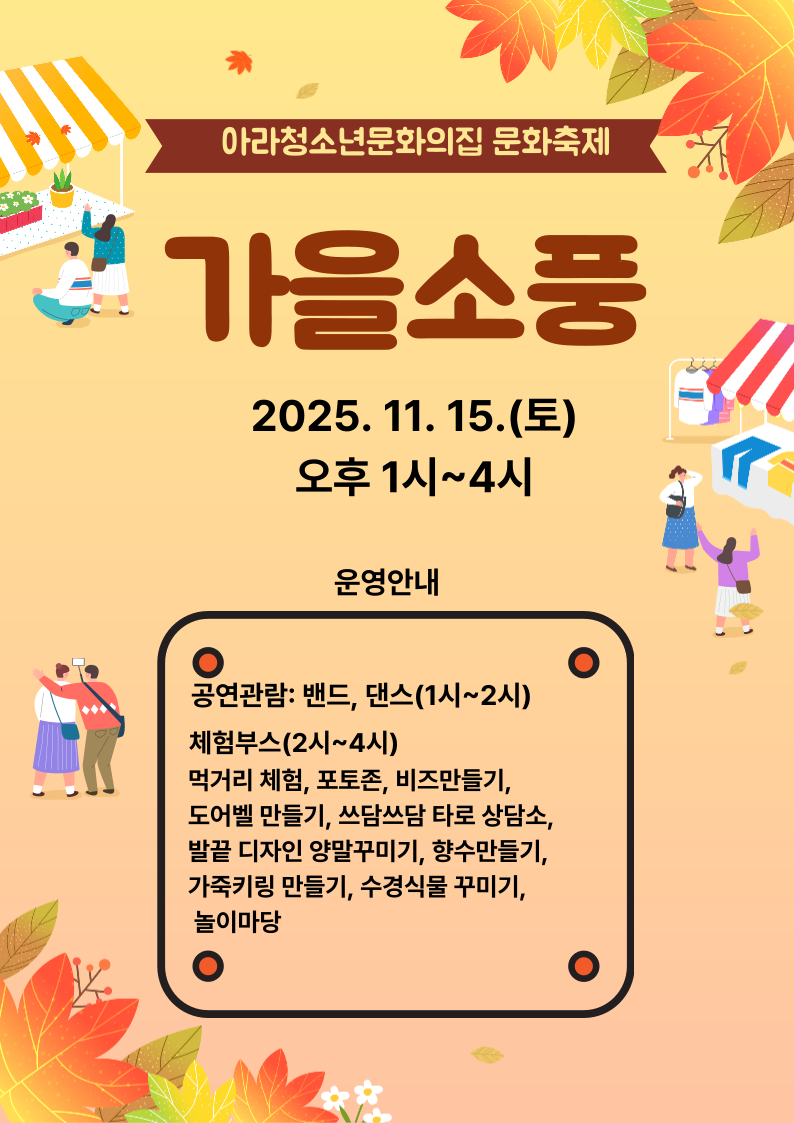 아라청소년문화의집 문화축제 '가을소풍'에 여러분을 초대합니다. 일시: 2025. 11. 15(토) 13:00~16:00 대상: 청소년 및 지역주민 내용: 공연관람 및 다양한 부스체험 마크라메 도어벨, 향수, 가죽키링 만들기, 수경식물 꾸미기, 비즈공예, 포토존, 놀이체험, 타로상담소, 양말꾸미기, 먹거리(컵케이크, 호떡, 아이스티) |