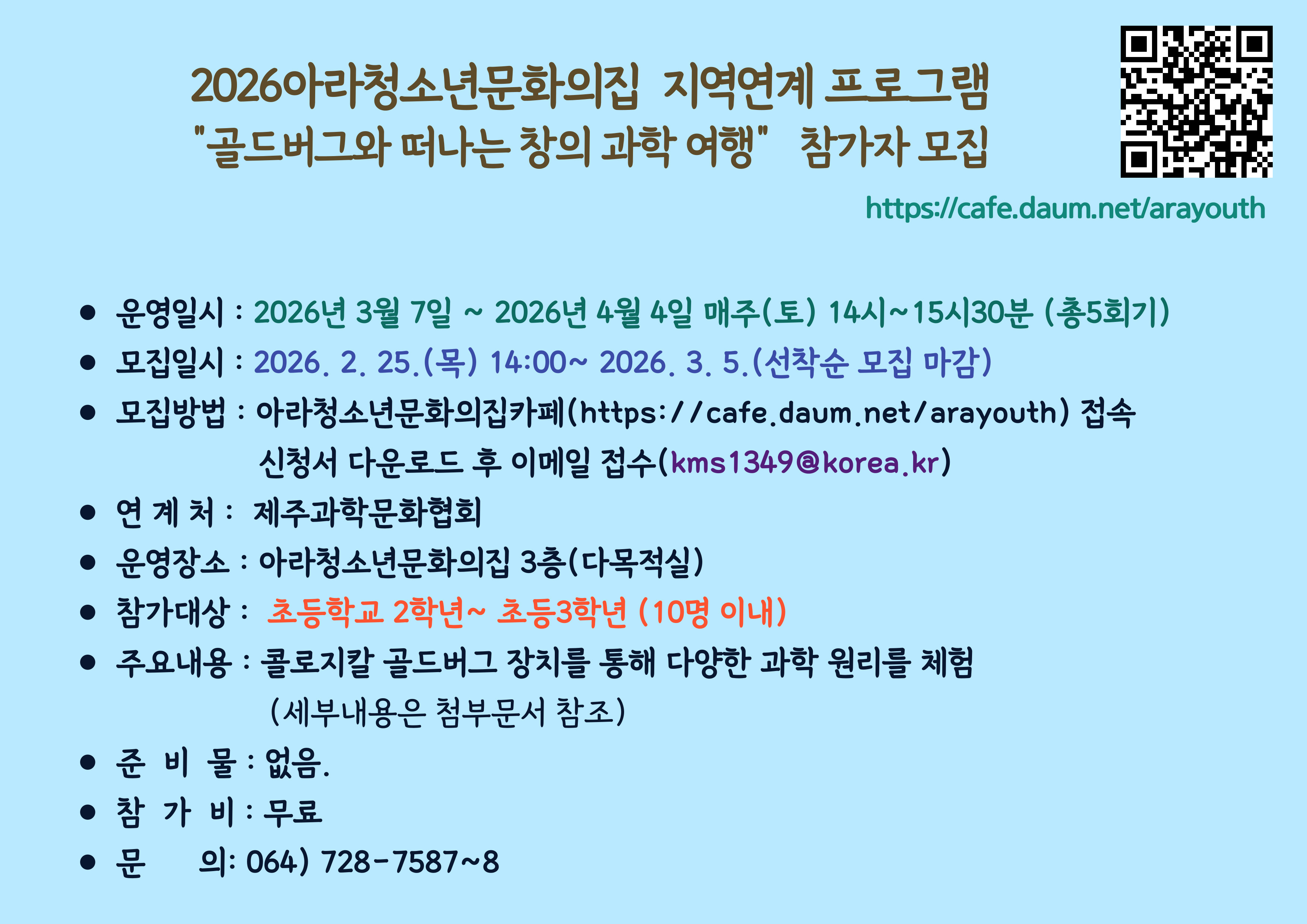 2026아라청소년문화의집 "골드버그와 떠나는 창의 과학 여행" 초등(저학년)참가자 모집 작성자아라청지사|작성시간26.02.12|조회수230 목록 댓글 1 글자크기 작게가 글자크기 크게가 참가대상 : 초등 저학년 (2학년~3학년)접수메일 : kms1349@korea.kr문의 : 064)728-7587 *세부내용 및 참가신청서는 첨부문서를 참조바랍니다. 세부계획및신청서(저학년_골드버그와 떠나는 창의과학).hwp69.50KB 첨부파일첨부된 파일이 2개 있습니다. jpg 파일 홍보(골드버그와떠나는창의과학).jpg 다운로드 hwp 파일 세부계획및신청서(저학년_골드버그와 떠나는 창의과학).hwp 다운로드 다음검색 현재 게시글 추가 기능 열기 북마크 공유하기 신고 센터로 신고 댓글 댓글 1 댓글쓰기 답글쓰기 댓글 리스트 작성자아라청지사 작성자 본인 여부 작성자 | 작성시간 26.02.25 아라청지사입니다~~! 프로그램 신청서 작성이 어려울 경우, 신청학생의 인적사항(이름, 학교,학년, 보호자 연락처) 기재후 이메일 접수 가능합니다. (문의 : 064-728-7587) 댓글 전체보기