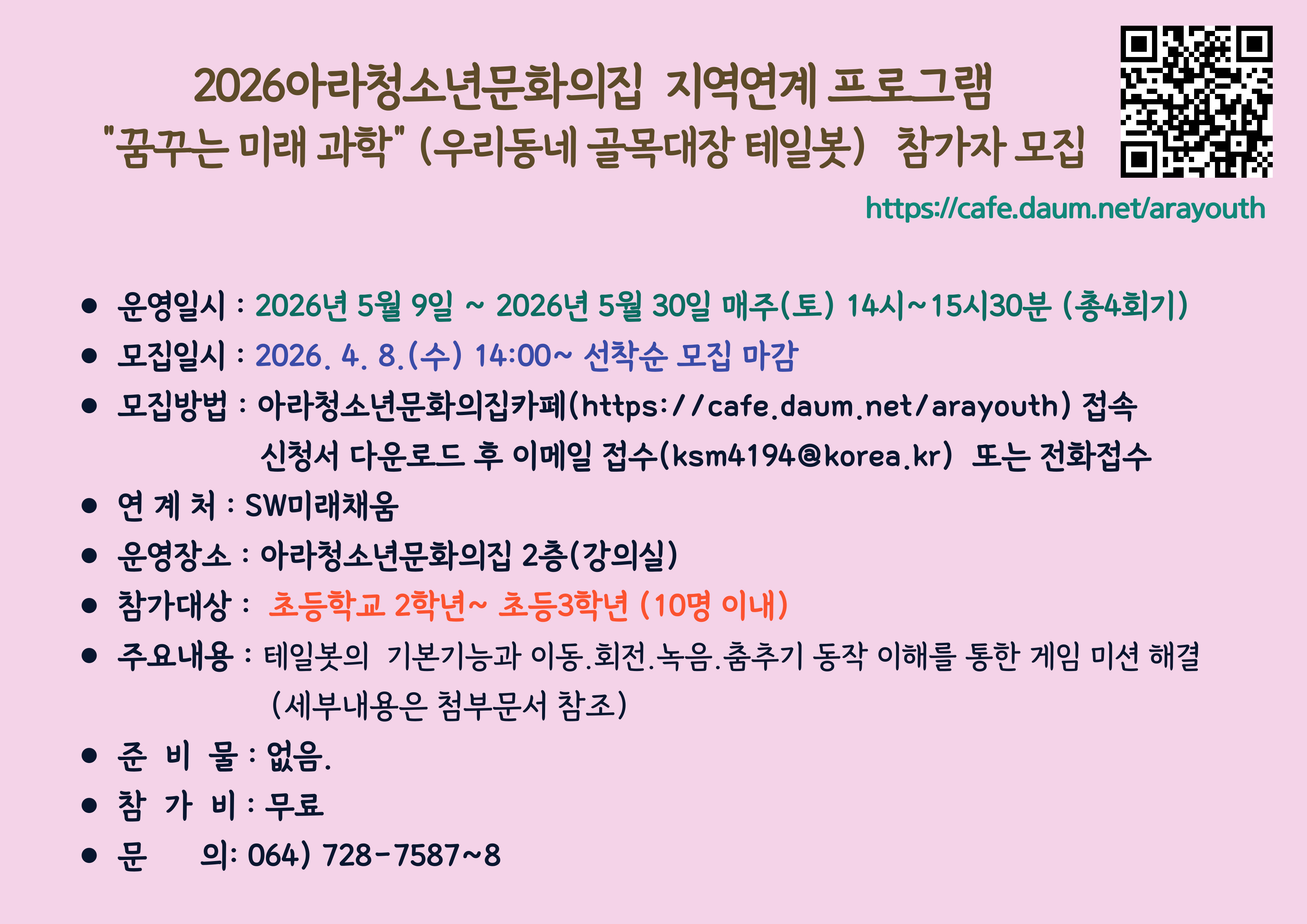 꿈꾸는 미래과학(우리동네 골목대장 테일봇) 참가자 모집 (저학년) 작성자아라청지사|작성시간26.03.31|조회수41 목록 댓글 0 글자크기 작게가 글자크기 크게가 세부계획및신청서(저학년_우리동네 골목대장 테일봇).hwp121.50KB이메일접수 : ksm4194@korea.kr전화접수 : 064)728-7588 첨부파일첨부된 파일이 2개 있습니다. jpg 파일 테일봇-001.jpg 다운로드 hwp 파일 세부계획및신청서(저학년_우리동네 골목대장 테일봇).hwp 다운로드 다음검색 현재 게시글 추가 기능 열기 북마크 공유하기 신고 센터로 신고 댓글 댓글 0 댓글쓰기 답글쓰기 댓글 리스트