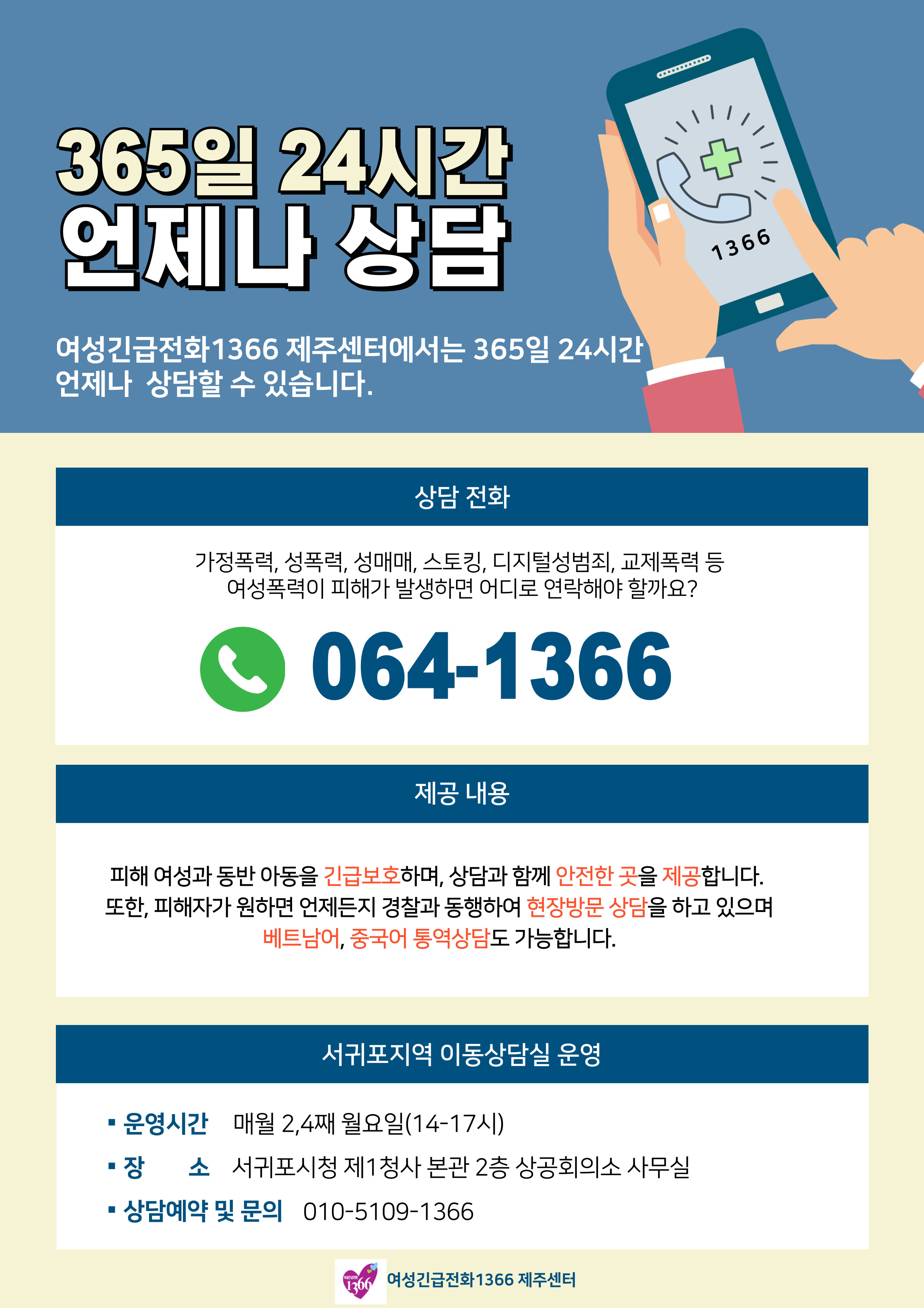 여성폭력 피해가 발생하면 어디로 연락해야 할까요? 작성자여성긴급전화1366제주센터|작성시간24.10.07|조회수11 목록 댓글 0 글자크기 작게가 글자크기 크게가 다음검색 현재 게시글 추가 기능 열기 북마크 공유하기 신고 센터로 신고 댓글 댓글 0 댓글쓰기 답글쓰기 댓글 리스트