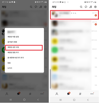 앞서 단톡방 배경화면까지 바꿨다면, 자주 쓰는 채팅방 또는 중요한 채팅방을 최상단에 고정해 채팅방을 찾는 번거로움을 덜어보자.