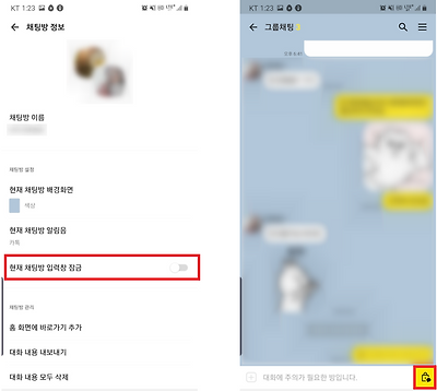 이 기능을 사용하면 회사 업무지시 및 보고용 단톡방 등 위험한(?) 채팅방에서 메시지 자체를 보내지 못하도록 막을 수 있다. '채팅방 입력창 잠금' 기능은 채팅방에 들어간 후 '설정→채팅방 설정→현재 채팅방 입력창 잠금' 기능을 켜두면 된다. 이 기능을 활성화하면 입력창에 '대화에 주의가 필요한 방입니다.'라는 메시지가 표시되고 기존처럼 창을 터치해도 키보드가 나타나지 않는다. 덕분에 실수로라도 다른 메시지를 보낼 수 있는 가능성을 원천 차단하게 된다.