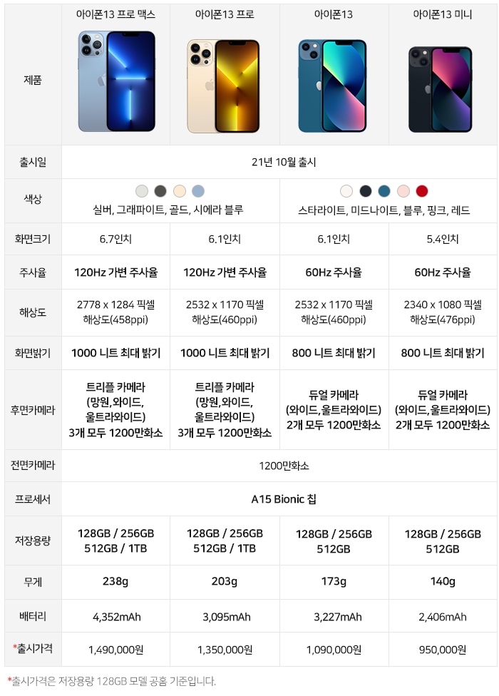 ▼ 아이폰13 전 시리즈 스펙 비교