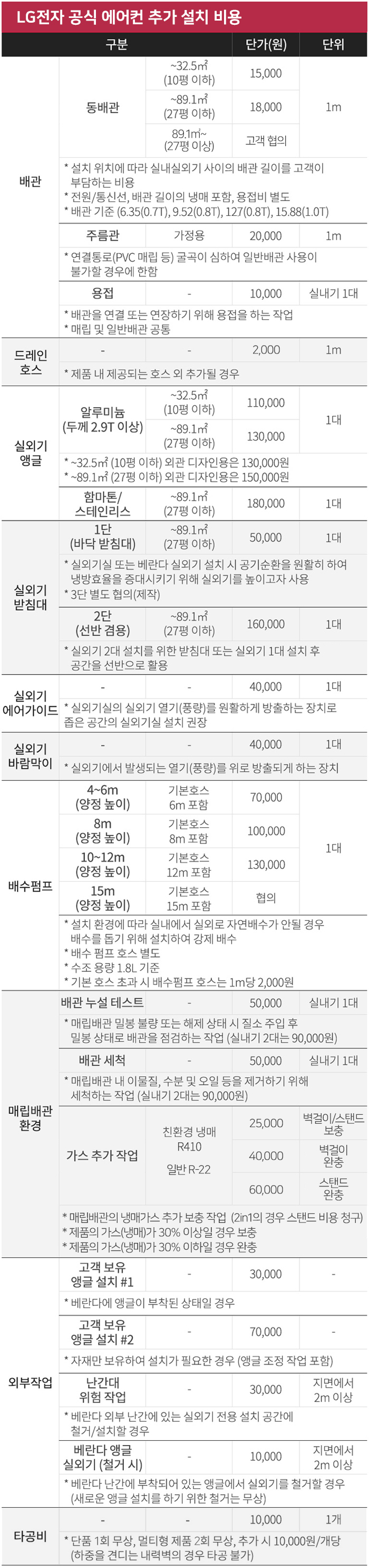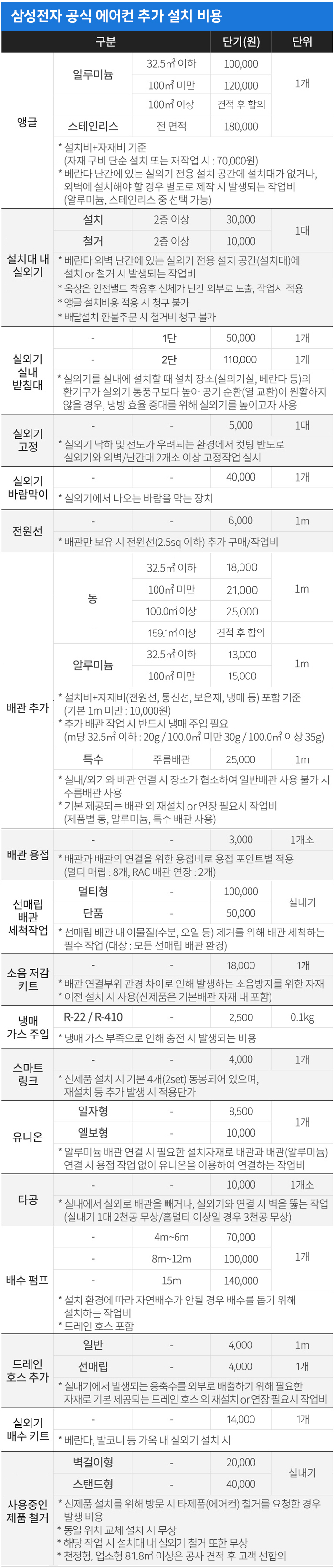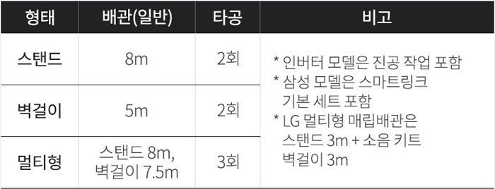 아래에서 LG전자와 삼성전자 공식 에어컨 구매 시 추가로 설치 비용이 드는 항목을 확인해보세요.