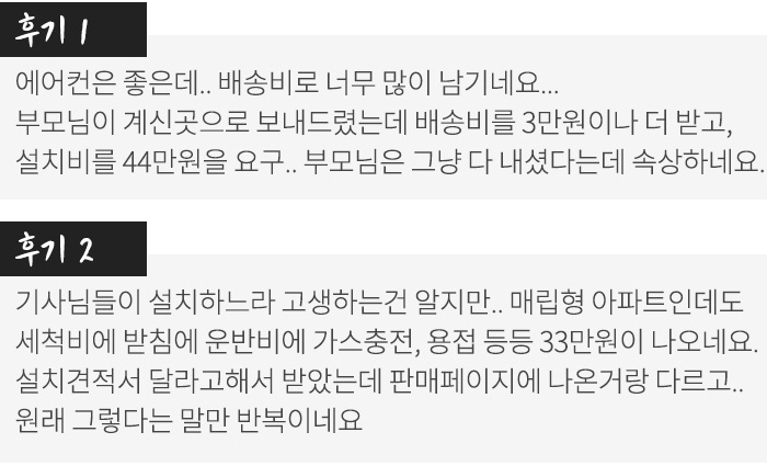 이처럼 에어컨 값이 싸다고 무조건 구매하지 말고 추가 설치비 항목과 후기를 꼼꼼히 살피고 잘 따져 보고 구매하는 것이 좋습니다.