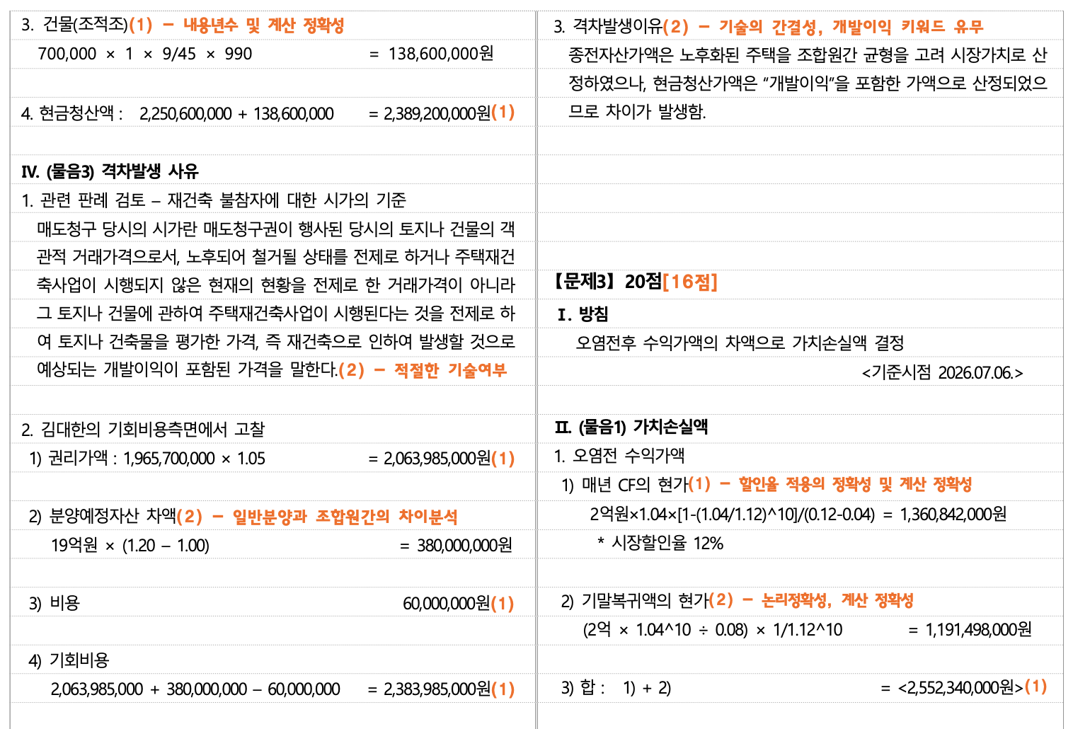 문제2번의 물음3에서 산정한 기회비용이 물음2에서 산정한 현금청산액보다 작은데 그렇다면 현금청산하는 것이 더 유리하다는 의미인걸까요? 그리고 <격차발생 이유>의 목차와 <기회비용측면에서의 고찰>이라는 목차의 연관성을 잘 이해하지 못하겠습니다.