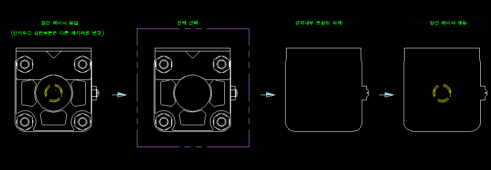 엔티티 하나하나를 지우고 트리밍하여 외곽도면을 준비하여 부분 조립도나 조립도를