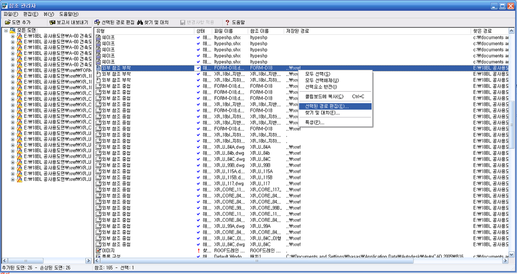 외부참조가 된 모든 도면을 열어서 한꺼번에 참조 경로를 바꿔줄수 있습니다.