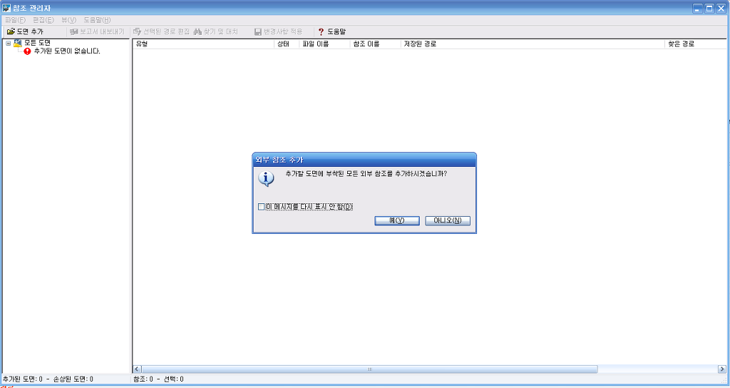 2. 참조 관리자 창이 열렸습니다. 좌측 상단에 도면 추가 보이시죠... 클릭...