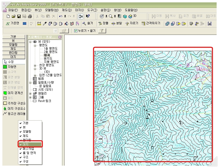 만약에 설계막대에 대지가 없는경우는 설계막대 우클릭후 대지를 선택해주세요.^^