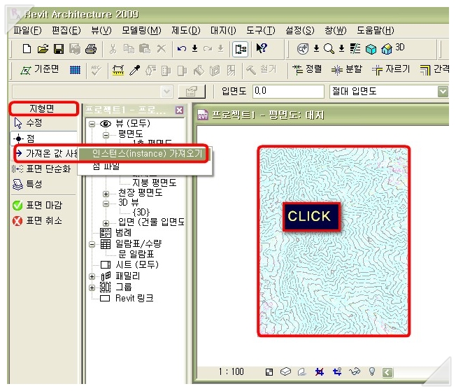 지형면중에서 가져온값사용 > 인스턴스가져오기 클릭후 > 수치지도(단일객체) 를 클릭합니다.