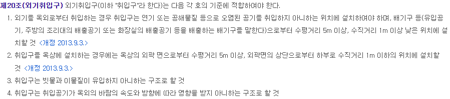 [법규]특피, 제연 외기취입구는 배기구에서 5m(수평), 1m(수직) 이격 작성자주말농부|작성시간22.07.28|조회수2,429 목록 댓글 1 글자크기 작게가 글자크기 크게가 특별피난계단의 계단실 및 부속실 제연설비의 화재안전기준(NFSC 501A) 다음검색 현재 게시글 추가 기능 열기 북마크 공유하기 신고 센터로 신고 댓글 댓글 1 댓글쓰기 답글쓰기 댓글 리스트 작성자시골쥐 | 작성시간 22.09.28 감사합니다. 댓글 전체보기