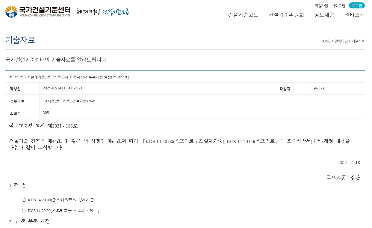 [[규준]]콘크리트구조설계기준 개정 안내 작성자moment|작성시간21.04.01|조회수560 목록 댓글 0 글자크기 작게가 글자크기 크게가 고시문(콘크리트_건설기준).hwp16.00KB 첨부파일첨부된 파일이 4개 있습니다. jpg 파일 D:\기준개정알림.jpg 다운로드 hwp 파일 D:\고시문(콘크리트_건설기준).hwp 다운로드 jpg 파일 D:\해설집.jpg 다운로드 jpg 파일 D:\예제집.jpg 다운로드 다음검색 현재 게시글 추가 기능 열기 북마크 공유하기 신고 센터로 신고 댓글 댓글 0 댓글쓰기 답글쓰기 댓글 리스트