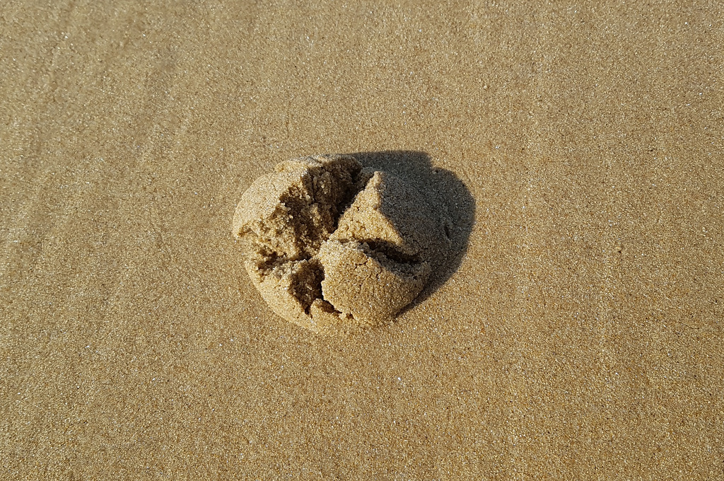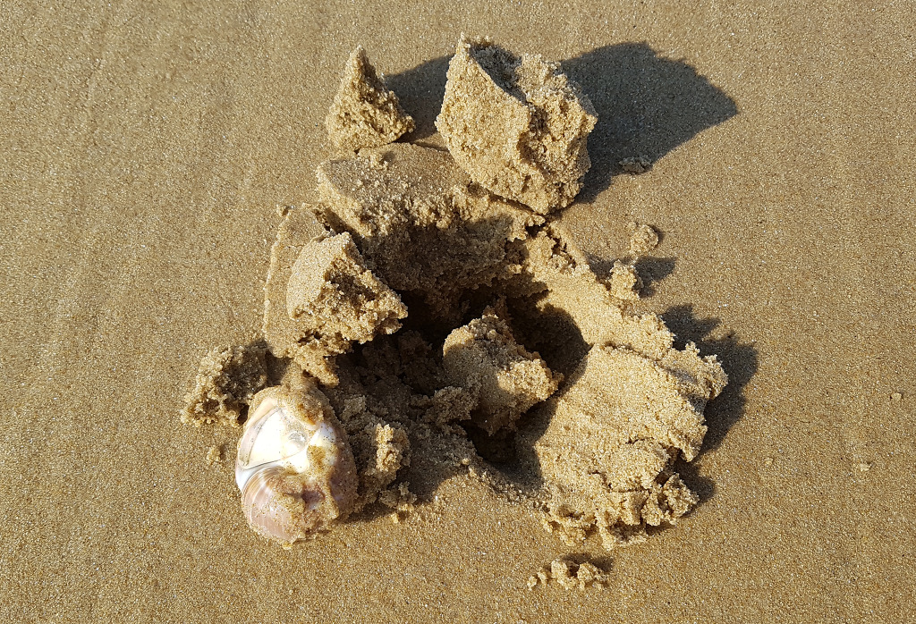 갈라진 모래의 범위가 제법 커 보이는것이 저 속에 큰우렁고둥이 있는것 같다.