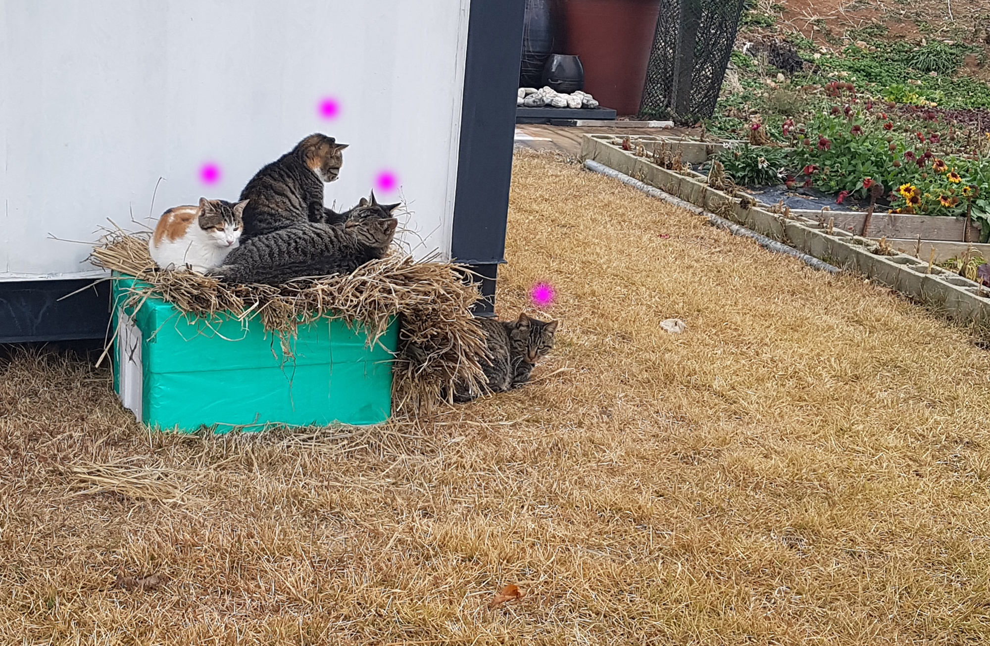 스티로폼박스를 저곳에 갖다 놓은지 두달이 지나도 아무도 올라앉지 않더니 볏짚을 깔아주니