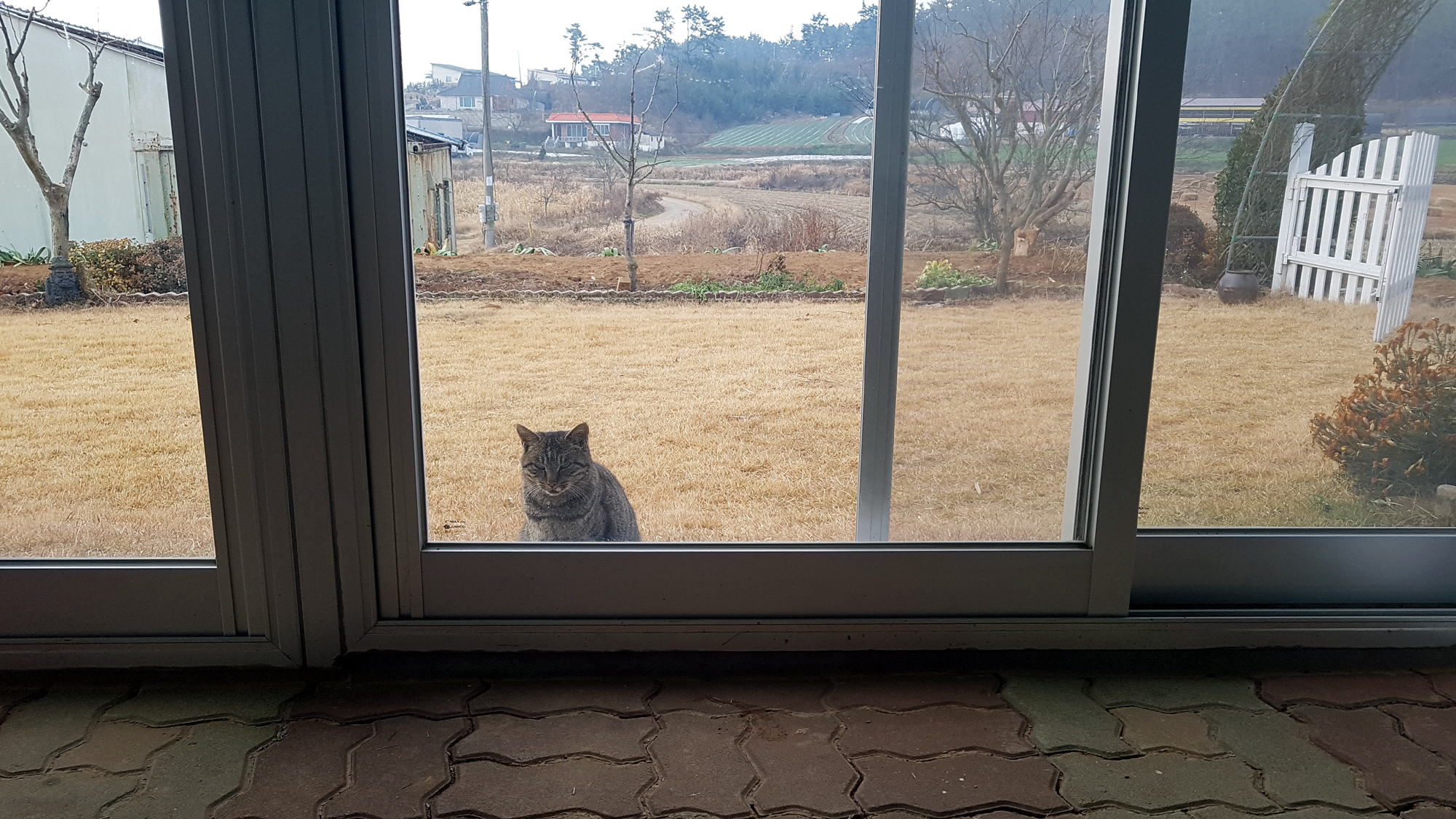 늘 문앞을 지키고 앉아서 저렇게 안을 들여다보고 있어 부담스러워 밖을 내다볼 수가 없다.