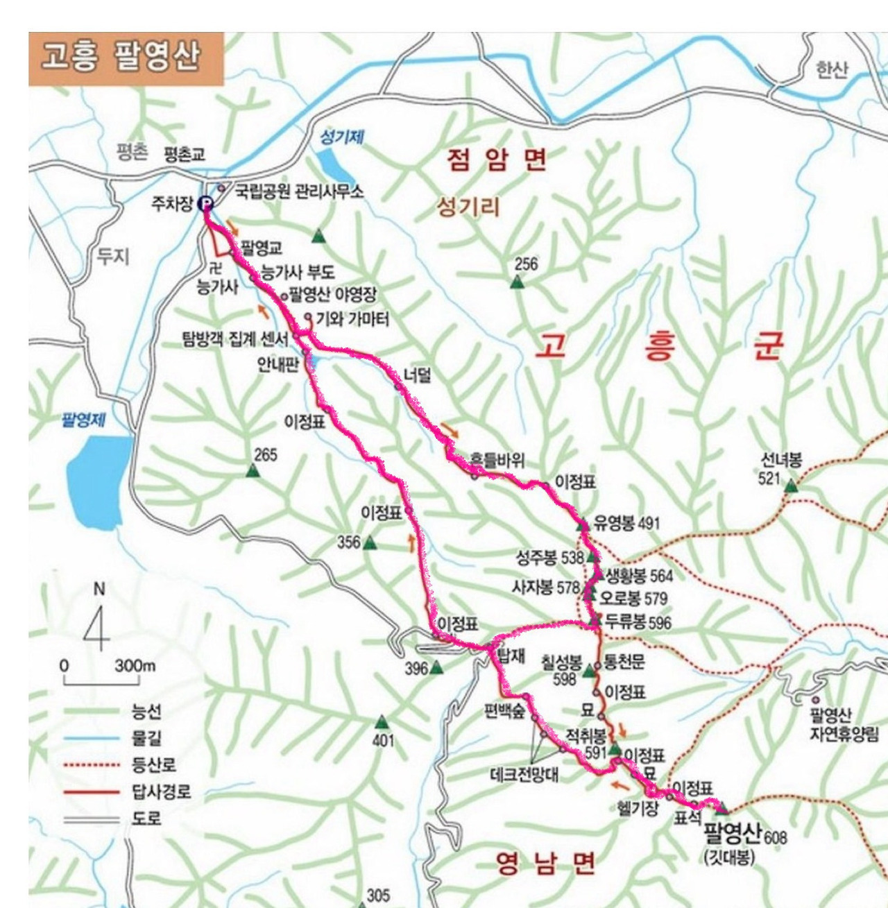 ---통천문---이정표----팔영산(깃대봉)---헬기장---이정표---데크전망대--