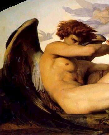 카바넬의 "추락한 천사" 또한 그러한 시각을 어느 정도 반영하고 있는 것같습니다. 이 그림에서 루시퍼는 추악한 괴물이 아니라 어둡고 강렬한 눈빛을 지닌 아름다운 청년으로 묘사되어 있습니다. ( 이 그림을 보고 삼류만화에 나오는 대마왕 같다고 비웃은 녀석도 있었지만 말입니다 -_-;; )