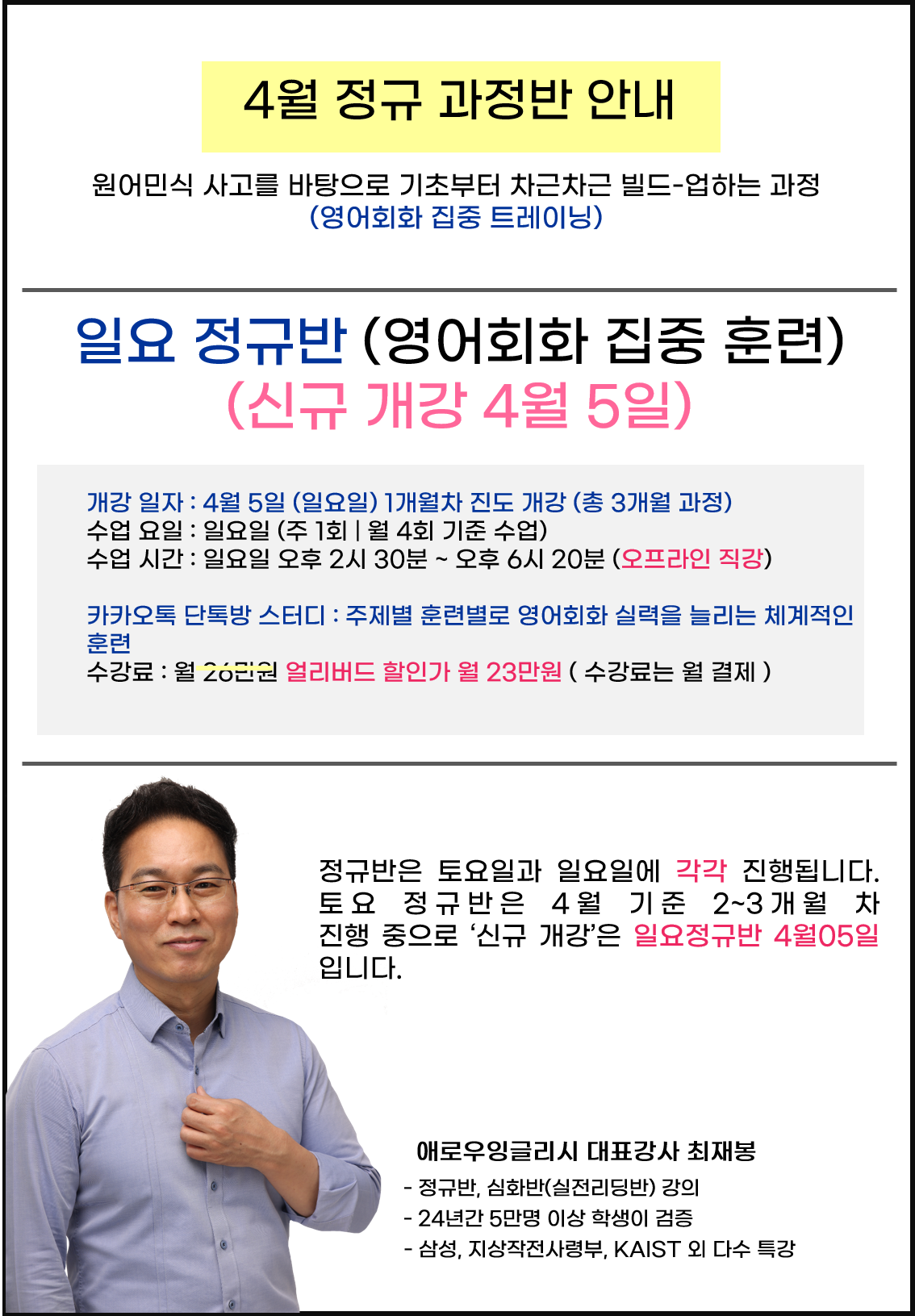2026년 3월~4월 강남본원 강의시간표 작성자애로우 잉글리시|작성시간25.07.24|조회수915 목록 댓글 0 글자크기 작게가 글자크기 크게가 문의 : 02-422-7505또는카카오톡 플러스친구 (애로우잉글리시강남본원) 수업 전 최재봉 선생님 수업 분위기 알아보는▼ 무료특강 신청하기 ▼ 다음검색 현재 게시글 추가 기능 열기 북마크 공유하기 신고 센터로 신고 댓글 댓글 0 댓글쓰기 답글쓰기 댓글 리스트