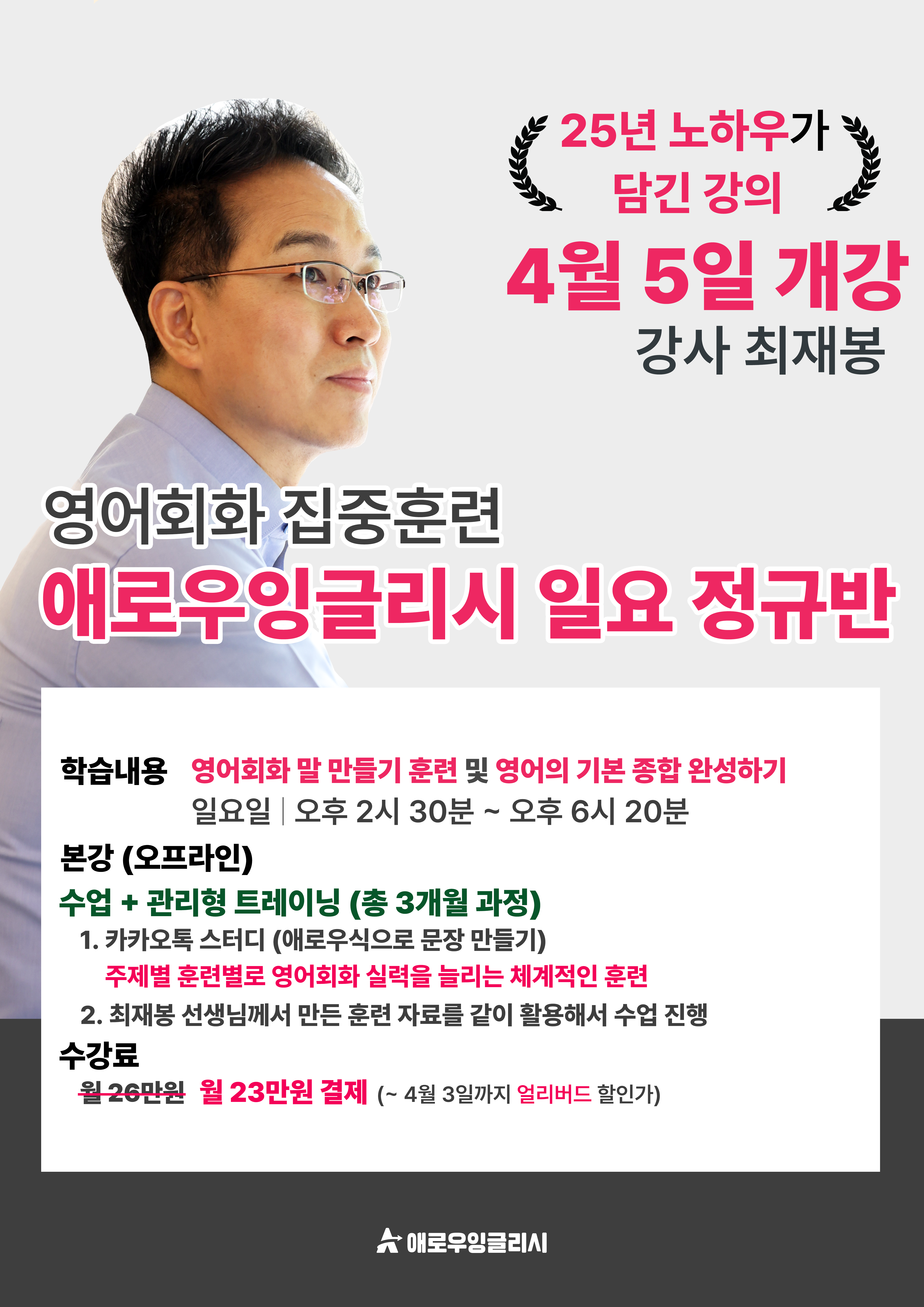 [4월 5일 신규 개강] 일요 정규반(영어회화 집중 훈련반) 작성자애로우 잉글리시|작성시간25.08.01|조회수2,009 목록 댓글 0 글자크기 작게가 글자크기 크게가 [진도 프린터 샘플] [훈련 프린터 샘플] 다음검색 현재 게시글 추가 기능 열기 북마크 공유하기 신고 센터로 신고 댓글 댓글 0 댓글쓰기 답글쓰기 댓글 리스트