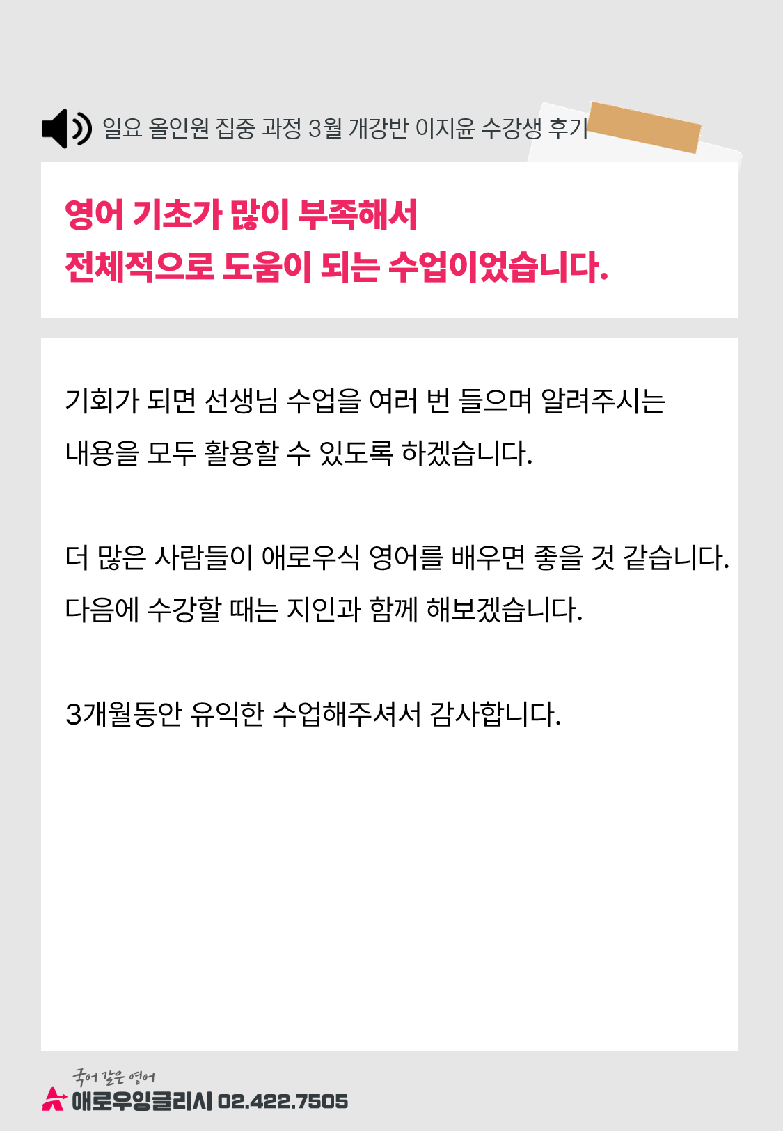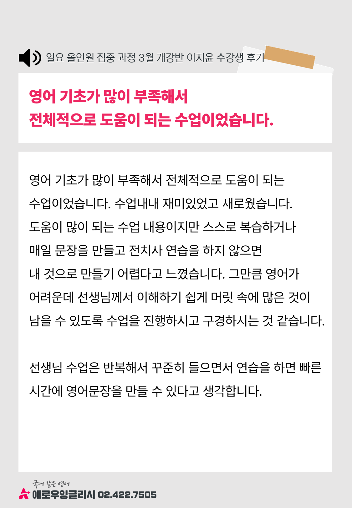 (2025년 3월 개강반) 일요 영어회화 집중 훈련반 후기 : 영어 기초가 많이 부족해서 전체적으로 도움이 되는 수업이었습니다.