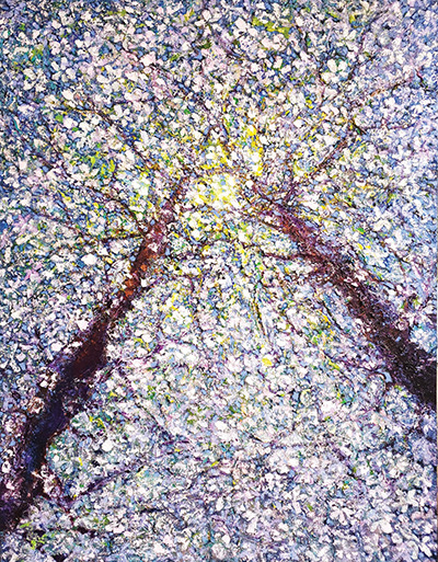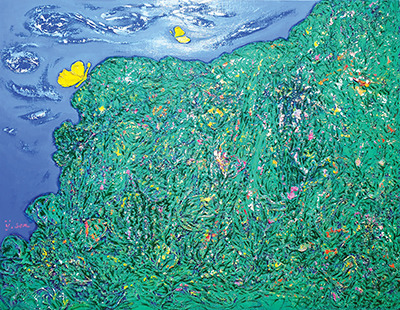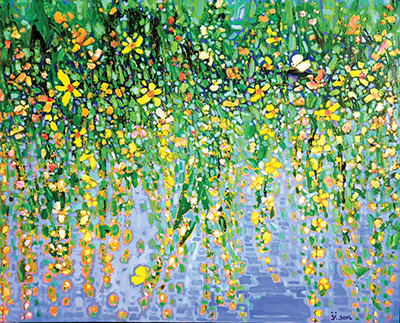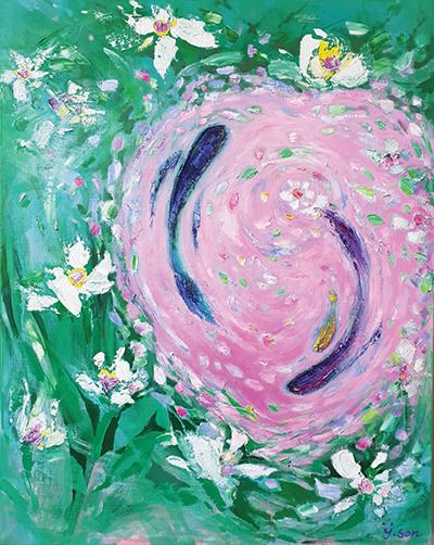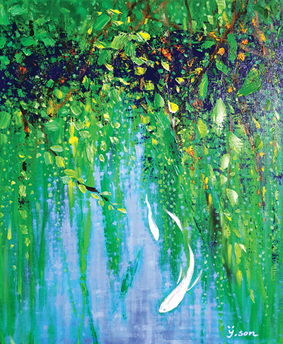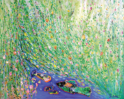 생명의 숲에서 나무로 새싹으로 들꽃으로 관심을 기울이며 지난7년간 여러 garden 씨리즈(watered garden, Blue garden, In the garden, From the garden)를 그려왔다. 나의정원을 캔버스에 가득채워 가며 벅찬감동과 기쁨을느꼈다. 점과 선과 색들이 서로 어우러저 garden의 내면의 소리와 향기가 많은 이들에게 전해지길 바란다. 들꽃의 향기가 은은하게 퍼지고 맑은 시냇물에 나뭇잎 하나가 바람에 날리어 떨어지는 장면을 눈을 감고 상상해본다.