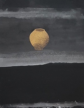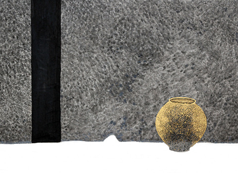 사의(寫意), 형상이 아닌 의미를 옮기는 것이라고 했던가, 무언가 아련한, 미지의 세계인 양 해무 깃든 듯한 2018년작 <독도 1>은 그 단어의 근원을 열람케 하는 대표적인 작품이다. 시원하고 아득한 공간감과 여백의 미, 정적인 운율을 가득 품은 형상과 배경은 차분하면서 오묘한 감정을 불러온다. 독특한 묵(墨)의 결 또한 잘 살려내고 있는데, 고된 노동력을 뒷받침되어야 가능할 정도로 일일이 점을 찍어 그린 <독도2>와, <귀향>에서 극에 달한다.