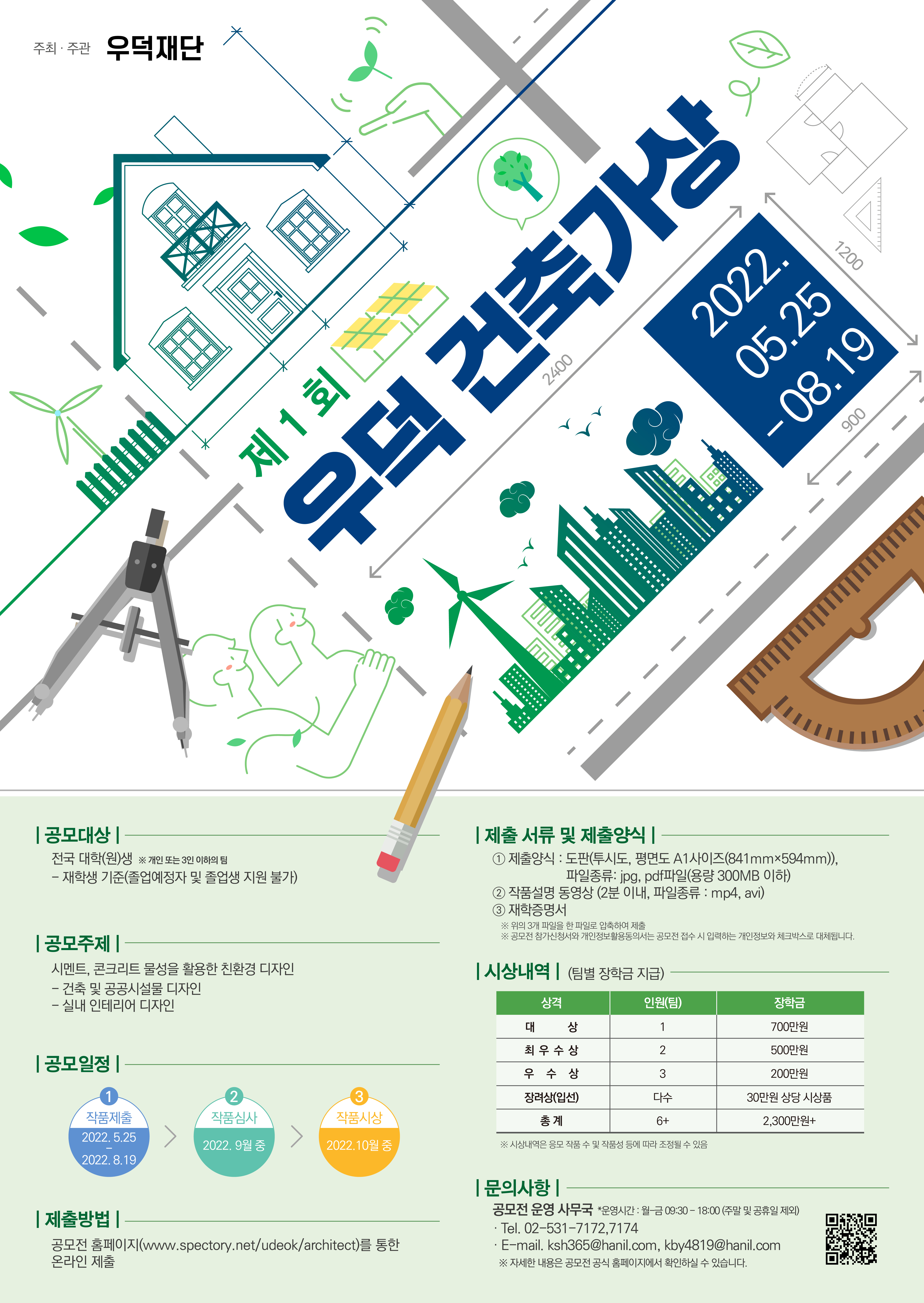 ※ 자세한 내용은 공모전 공식 홈페이지(www.spectory.net/udeok/architect)에서 확인하실 수 있습니다.