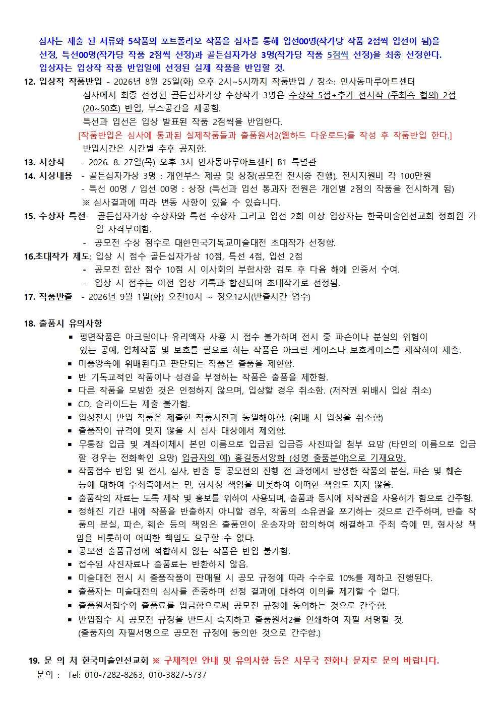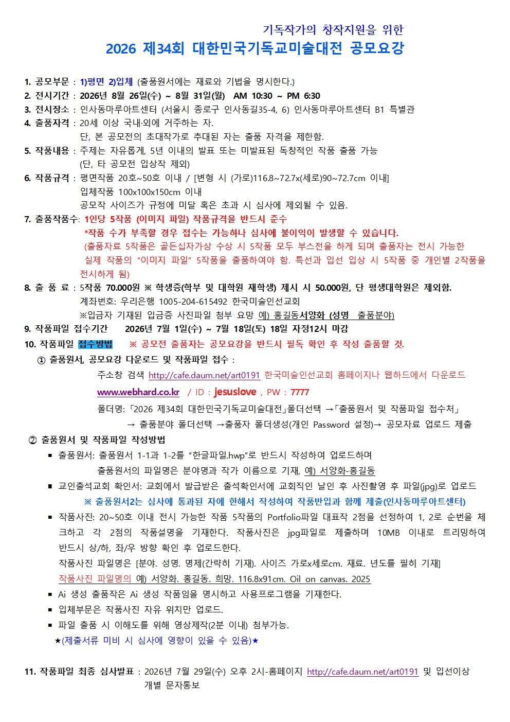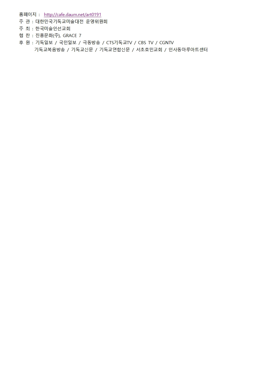 2026년 제 34회 <대한민국기독교미술대전> 공모요강 및 출품원서 작성자김선경|작성시간26.02.19|조회수202 목록 댓글 0 글자크기 작게가 글자크기 크게가 2026 제34회 대한민국기독교미술대전 공모요강-최종.pdf143.92KB출품원서(1).hwp44.00KB출품원서(2).hwp255.50KB 첨부파일첨부된 파일이 6개 있습니다. jpg 파일 2026 제34회 대한민국기독교 미술대전 공모요강003.jpg 다운로드 jpg 파일 2026 제34회 대한민국기독교 미술대전 공모요강001.jpg 다운로드 jpg 파일 2026 제34회 대한민국기독교 미술대전 공모요강002.jpg 다운로드 hwp 파일 출품원서(1).hwp 다운로드 pdf 파일 2026 제34회 대한민국기독교미술대전 공모요강-최종.pdf 다운로드 hwp 파일 출품원서(2).hwp 다운로드 다음검색 현재 게시글 추가 기능 열기 북마크 공유하기 신고 센터로 신고 댓글 댓글 0 댓글쓰기 답글쓰기 댓글 리스트