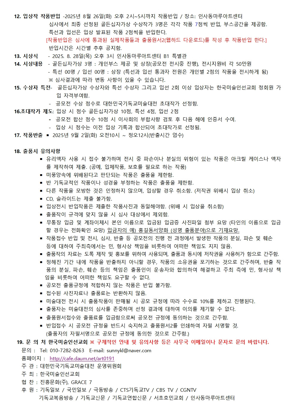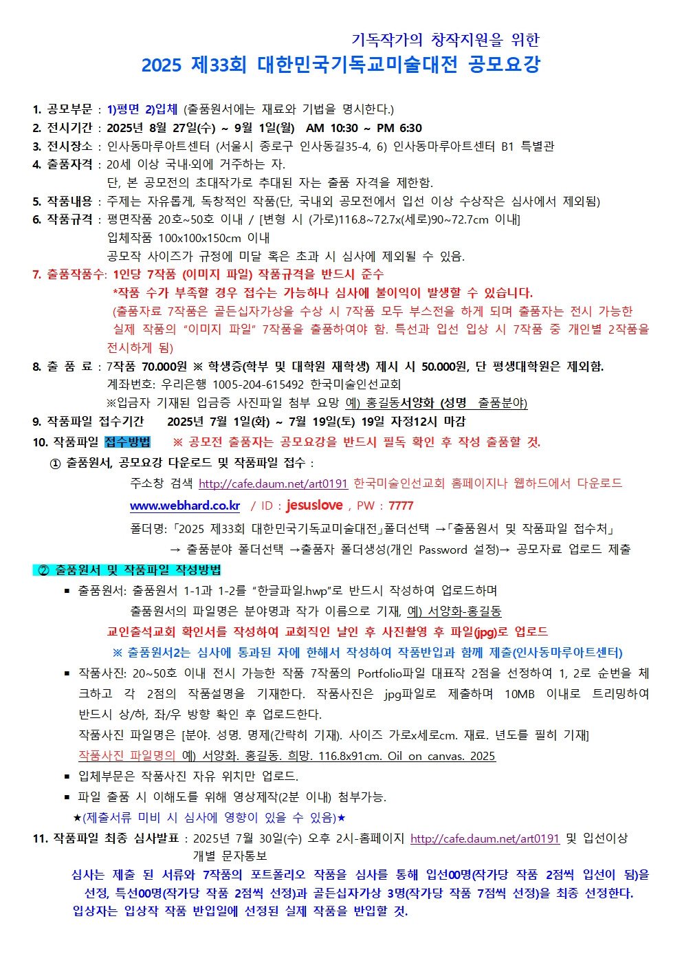 2025 제 33회 대한민국기독교미술대전 공모요강 작성자김선경|작성시간25.03.10|조회수979 목록 댓글 0 글자크기 작게가 글자크기 크게가 2025 제33회 대한민국기독교미술대전 공모요강-홈피용.pdf144.28KB2025 제33회 대한민국기독교미술대전 공모요강-홈피용.hwp100.50KB 첨부파일첨부된 파일이 4개 있습니다. jpg 파일 2025 제33회 대한민국기독교미술대전 공모요강-홈피용002.jpg 다운로드 jpg 파일 2025 제33회 대한민국기독교미술대전 공모요강-홈피용001.jpg 다운로드 pdf 파일 2025 제33회 대한민국기독교미술대전 공모요강-홈피용.pdf 다운로드 hwp 파일 2025 제33회 대한민국기독교미술대전 공모요강-홈피용.hwp 다운로드 다음검색 현재 게시글 추가 기능 열기 북마크 공유하기 신고 센터로 신고 댓글 댓글 0 댓글쓰기 답글쓰기 댓글 리스트