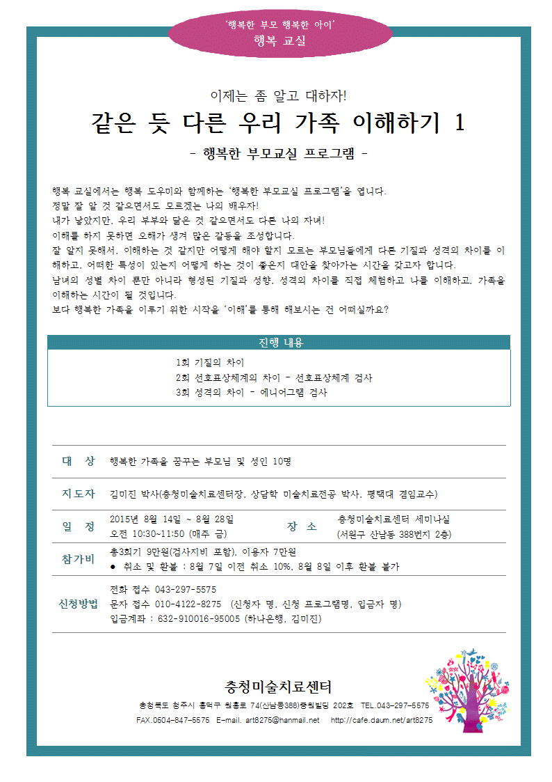 2015 행복부모교실 - 같은 듯 다른 우리 가족 이해하기 1 작성자충청미술치료센터|작성시간15.07.16|조회수38 목록 댓글 0 글자크기 작게가 글자크기 크게가 다음검색 현재 게시글 추가 기능 열기 북마크 공유하기 신고 센터로 신고 댓글 댓글 0 댓글쓰기 답글쓰기 댓글 리스트