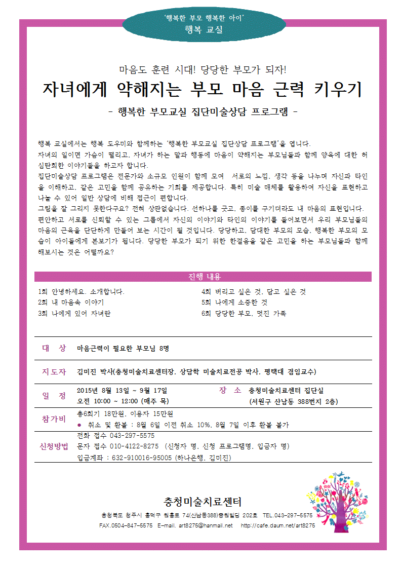 2015년 행복 부모교실 - 자녀에게 약해지는 마음 근력 키우기 - 집단미술상담프로그램 작성자충청미술치료센터|작성시간15.07.16|조회수51 목록 댓글 0 글자크기 작게가 글자크기 크게가 다음검색 현재 게시글 추가 기능 열기 북마크 공유하기 신고 센터로 신고 댓글 댓글 0 댓글쓰기 답글쓰기 댓글 리스트